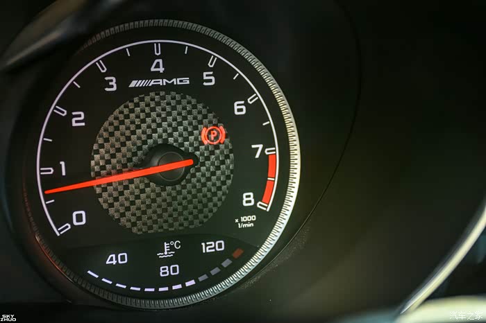 仪表盘是经典的双筒炮,左边为时速表,表底320,下方是油量表,右边为转速表,上方正中间带有AMG标志,中间都是碳纤维材料,充满运动感。