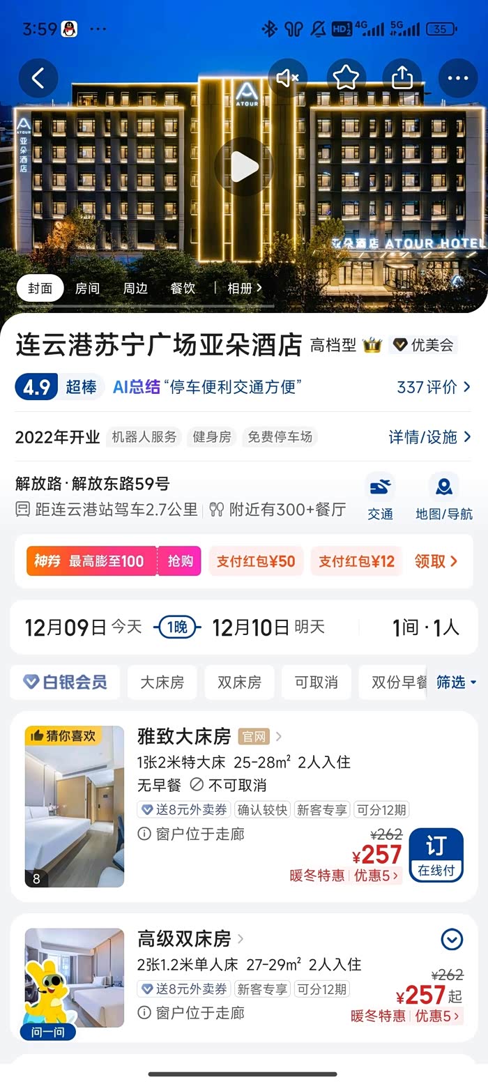 到达连云港,进入城区之后,有两个红绿灯.是对向行车,可把外地人惊讶到了,还好跟着其他车走的住宿亚朵,这个店一般般……在去吃饭的路上,看到一家新开的亚朵,2024刚开业好新,比我们定的还便宜10¥把我后悔的哟.……有姐妹看到的话,吃我的教训,长你的一个智慧!定新的这个啊啊啊