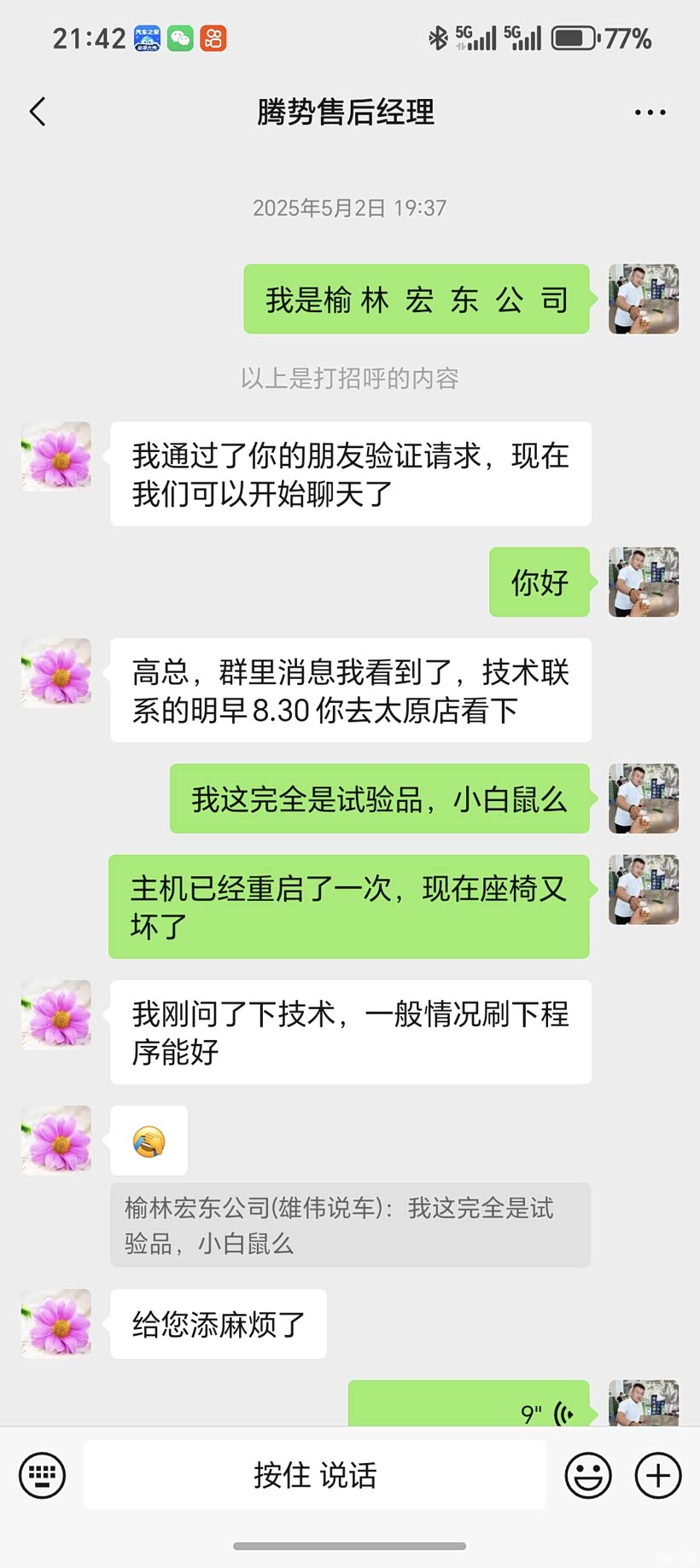 我是第一批腾势N9的车主,本来我是不打算说了!但是直到今天,竟然影响到我的人生安全!必须要说道说道!刚买下大问题没有,小问题不断,车机卡死,断网!4S说的重新启动!二排座椅不能调,5.1在太原出现的故障!去4S店刷了下系统,好了!7月份右侧车窗条直接撬起来了!我换了10台车了,从4万到160万的车都拥有过!第一次见新车出现这情况!比起今天发生的事,以上都是小问题!带着一家人去西双版纳,走到云南磨昆高速,一直都是下坡,坡陡弯急,车流量又大,速度都快,路还窄,号称死亡高速,走到玉溪元江刚好天晚了,老婆说太危险!到元江住一晚!刚下高速,车辆非常颠簸,我总以为路不平,结果前悬架直接塌窝!假如要是没下高速,后果不堪设想!老铁保佑🙏 而且智驾领航中,130迈巡航中,前面啥也没有,直接给你来一脚刹车,播报的不好意思,刹车太急了!今天一路至少3,4次!不知道你们遇到过没?