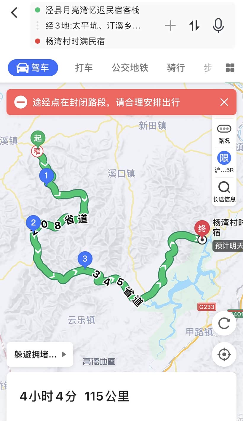 10:00 出发 泾县忆迟名宿—皖南川藏线(汀溪乡入口)—杨湾村时满民宿 115km