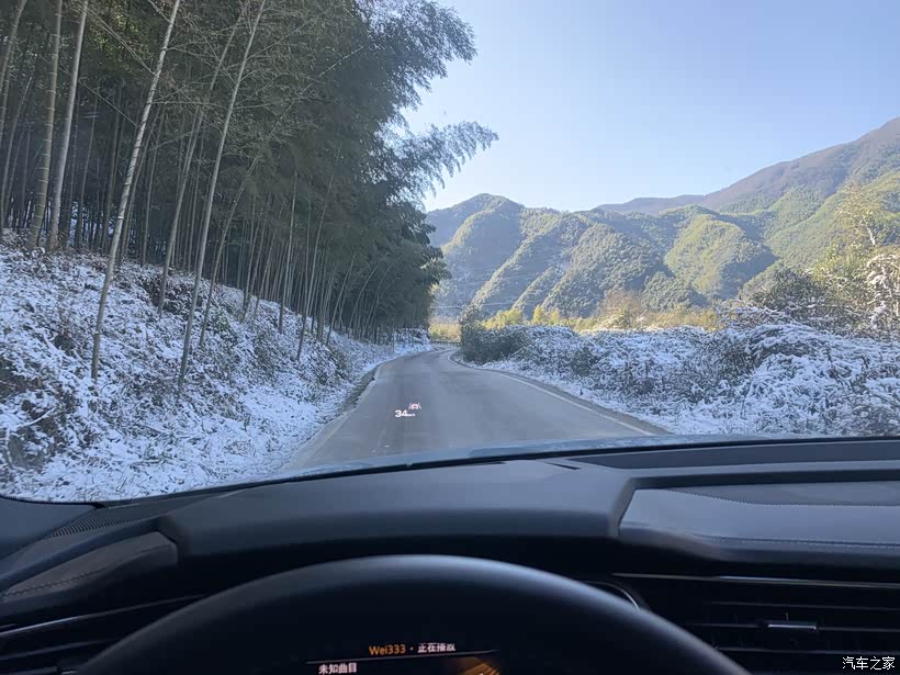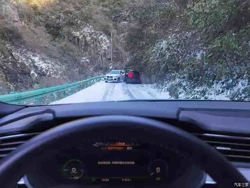 走出村庄便是进入桃岭天路.此时已发现有些车已掉头返回,原来前面有一小陡坡路面结冰,好几辆车无法通行.待他们退出后,e-tron确轻松通过,此时不得不再为奥迪的e-quattro四驱点鼓掌。但是随我同行的前驱小伙伴却在小陡坡上苦命挣扎,无法前行。此时我又遇到了困难的选择.是继续前行,挑战困难?还是掉头返回,不忘友情?