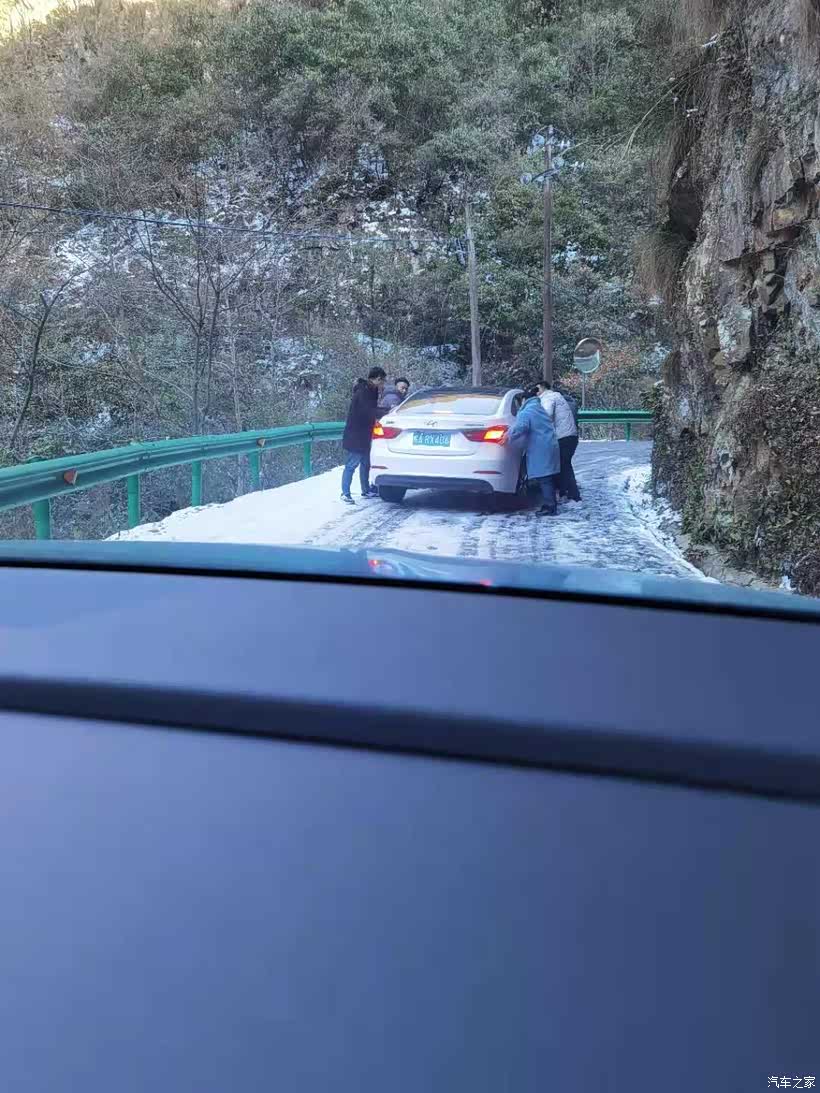 在进入桃岭天路5km处,我们就看见转弯处因路面冰冻打滑,导致两车交汇时相撞!行至10km处一转弯陡坡处车辆打滑无法前行,最终在众人的帮助下脱困.