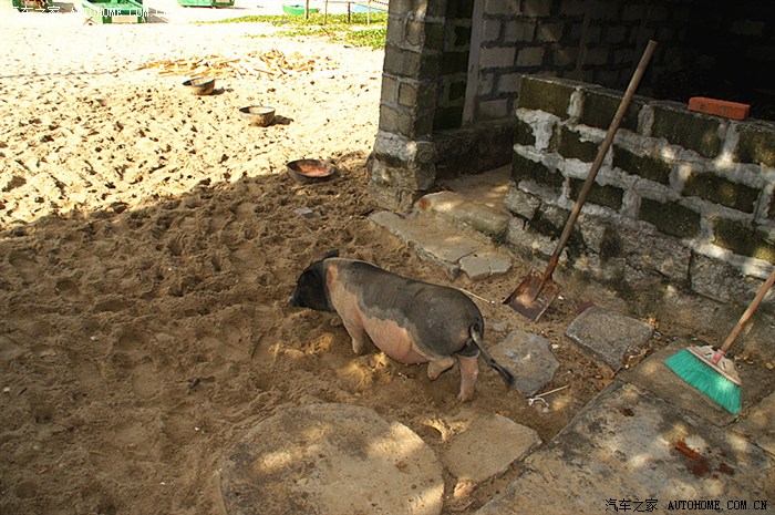 第二天是去的大洲岛,一大早就有车来接,是七座的商务车,坐了两个多小时,到了海边的一个小渔村,我们要从这里坐快艇去大洲岛,小渔村里有鸡和小猪,都不怕人,人从旁边过,它们眼睛都懒得抬。很奇妙吧,原以为在海南不会见到的动物,