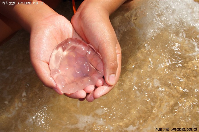 这边海里有很多水母,这种水母在海里有点淡淡的紫色,没有长须,教练说不蛰人的,我是第一个抓的哦,抓出来后象个小碗,就象这个样子,后来我们就抓水母,然后扔出去,看谁抓得多,看谁抓得大