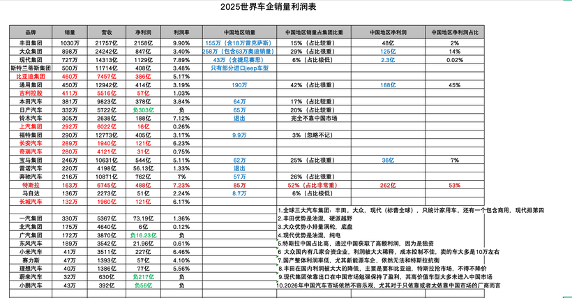 大众反差也太大了,销售额那么高,利润我记得之前比现代还高不少,短短几年就掉下去了.还有广汽,广汽丰田国内销量一直靠低价,丰田都救不了广汽.这表信息量蛮大的,不错。福特和马自达退出的可能性已经很大了