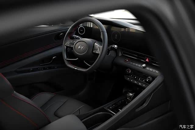 打开车门入座,相信你会和我一样再次感受到全新伊兰特N Line的运动风格。D型方向盘和高包裹性运动座椅上都有醒目的“N”标识,黑色基调搭配红色缝线点缀,挡杆采用战机式飞行挡把设计,激发驾驶欲望。新车不仅提供常规的红黑蓝白灰外观色,还有新增的镭射蓝、N Line专属钛金灰,在颜值这件事上,全新伊兰特N Line的确做得不错。