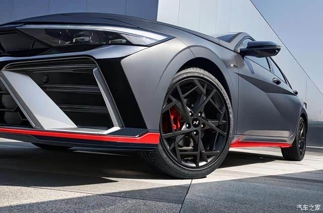 全新伊兰特N Line给我的第一印象是,车身低趴,确实有轿跑的味道,和现在新能源车普遍“饱满”的形象有所不同,其宽高比达到1.28,风阻系数仅0.27,像是为赛道而设计的产品。虽然这是一款定位亲民的家轿,但是走近细看,能够发现TA身上有许多沿袭N品牌赛道基因而来的设计,比如专属分体式蜂窝状进气格栅、黑色尾翼、红色制动卡钳等等,尤其是前后杆以及侧裙的红色N Line饰条,展现出浓厚的改装气息。