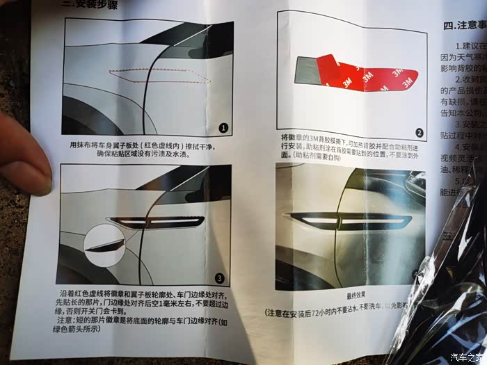 贴之前最好洗车或擦拭干净安装的位置,避免有灰尘影响胶的使用效果。拆开包装之后,首先仔细阅读说明书,上面有安装步骤和注意事项。