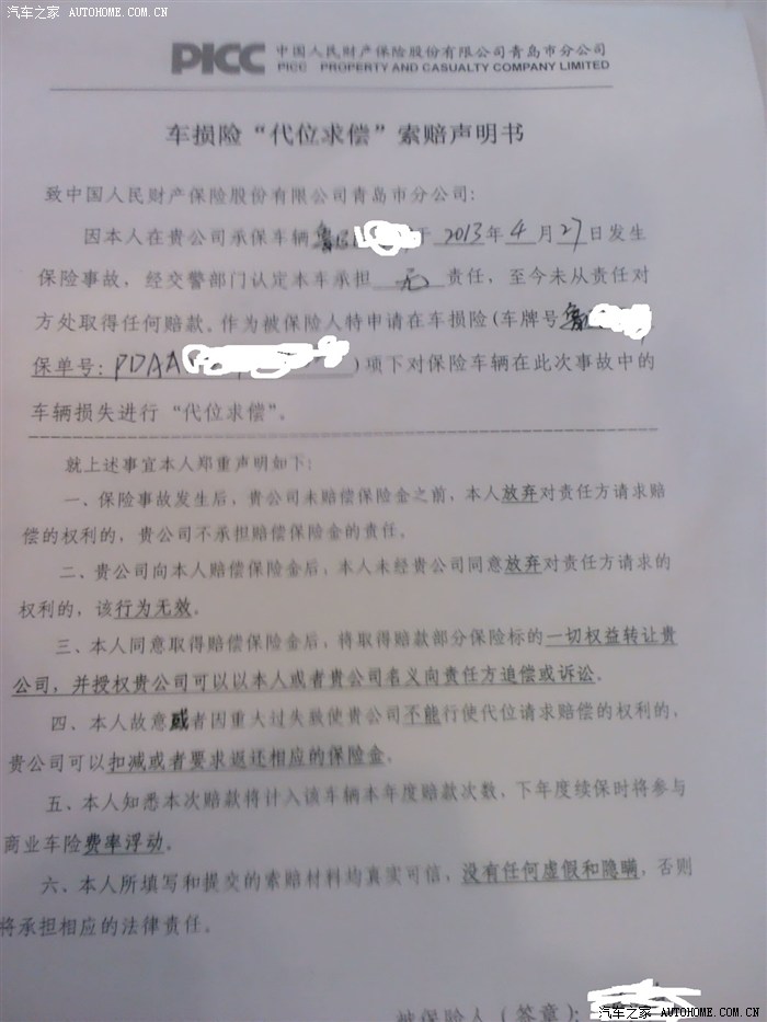 2013.6.25我带着材料去了青岛人保大厅咨询代位求偿事宜。工作人员还算配合,听我讲述事情经过。拿出表格让我填写,将证据交给工作人员。填写完材料需要到受理大厅抽号提交材料,工作人员看了下材料说是要我提供定损照片。这不扯淡吗,定损照片对方保险公司人员会给我吗,可笑。人保前台人员说是需要重新给我做案子,没有定损照片无法定损。也就是说对方保险公司的定损单人保不认可。我不干了,提高谈话分贝,要求见领导。要求人保给我拿出人保的条款证明需要提供照片。有一段话我很清楚:当初选择人保也是看中大公司有保障,可是当我需要人保帮我讨回公道时确处处为难我。我对人保很失望,我的金额也不大,我要的不是这点钱,而是公平,本应是人保应该履行的义务确以各种门槛为由拦截我。。。。。最终经过协商工作人员先把材料留下。