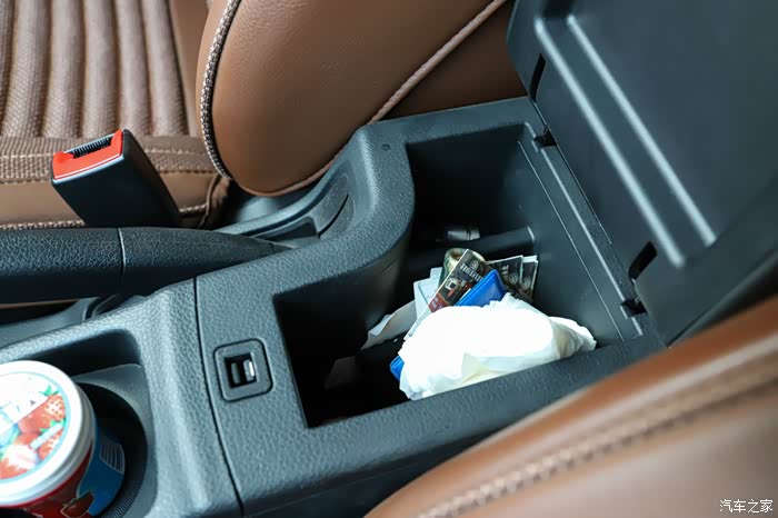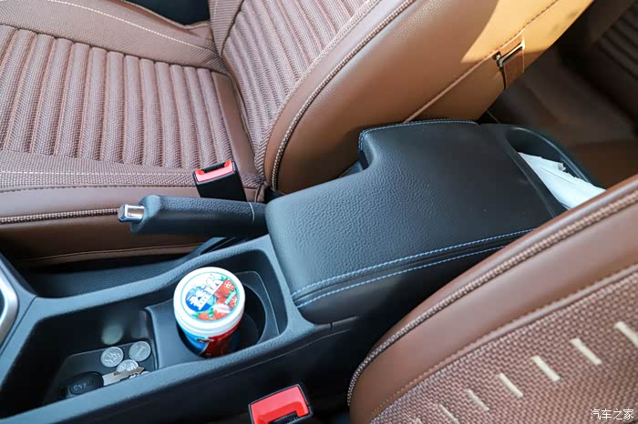 手刹旁边的储物空间不错,其中有一个专门的杯架,另外扶手盒也很方便,开车时手臂能自然的搭在上面,就是内部的空间比较小,放不了多少东西。