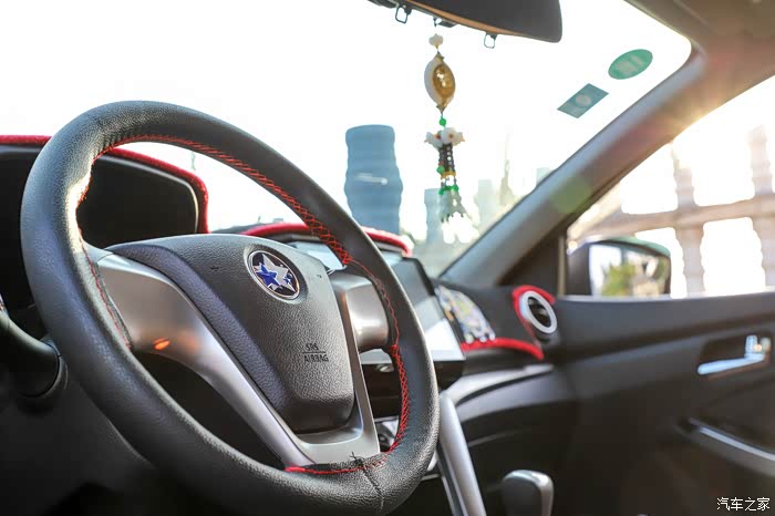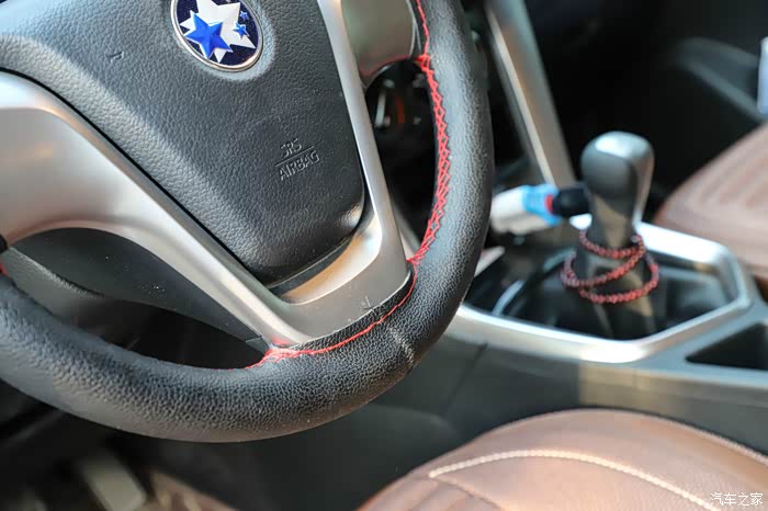 最低配的方向盘,双色设计,少了多功能按键,自己缝了真皮套,红色的缝线看上去比较运动,只是第一次操作没有经验,比较难看一点。