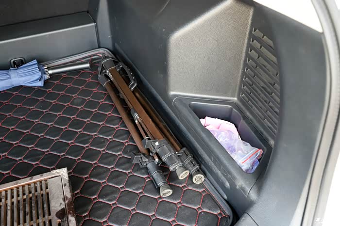 后备箱的空间是SUV的强项,比原来的轿车的装载能力大了一倍不止,有什么东西就使劲往里塞,右侧还有个小的储物盒,放点水杯水瓶之类的东西固定。
