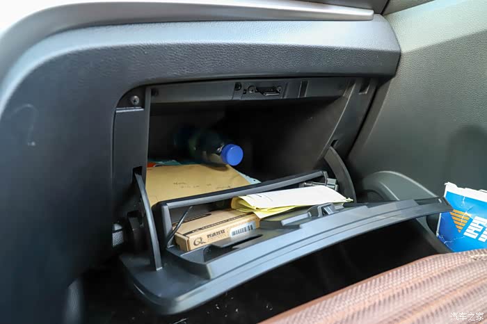 空间最大的莫属这个手套箱了,双层设计,纵深真的很厉害,我往里面放了一瓶脉动来展示空间,依旧是刚露出一个瓶盖,你就知道打底有多深了。