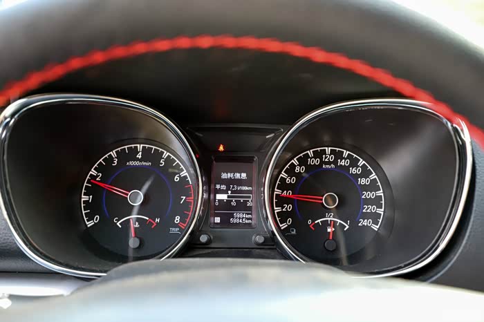 双炮筒设计的仪表盘,中间有个小的液晶屏显示行车信息,包括油耗、续航等等,一般我加满油能跑700-800公里,跟表显的7.3差不多油耗,之前跑高速的时候,120公里的情况下转速突破了3500转,如果是六档的话,估计会省油不少。