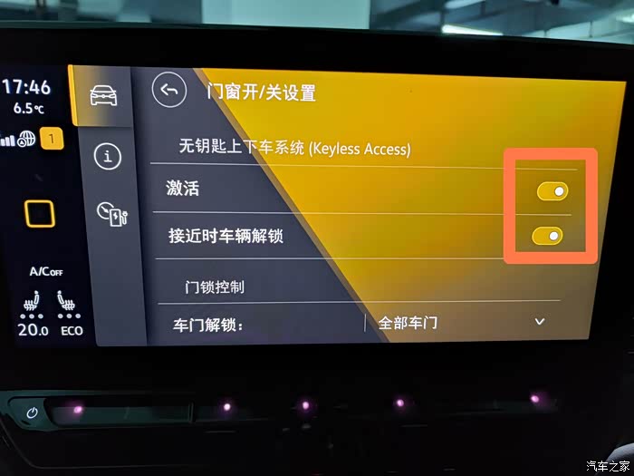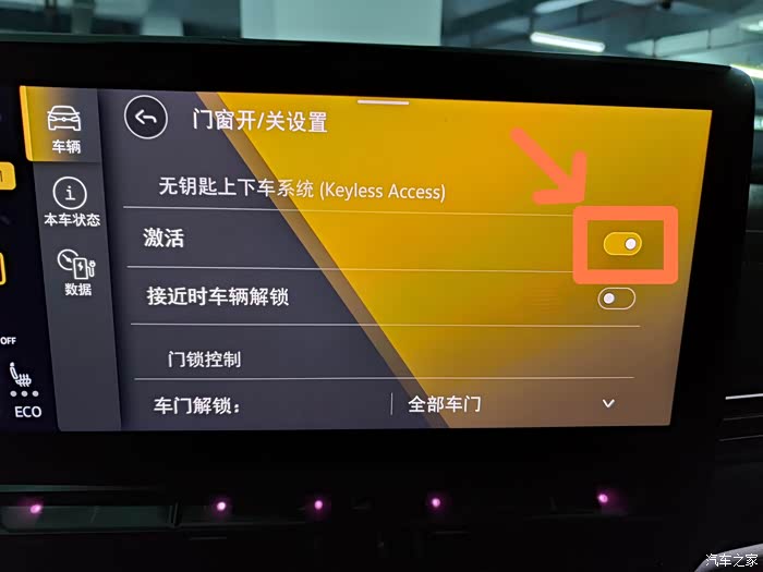 ID4X的无钥匙功能设置位于:车辆——门窗开/关设置——激活。一般车辆会默认,打开无钥匙功能,如果想要关闭,可以再次点击激活按钮,关闭该功能。