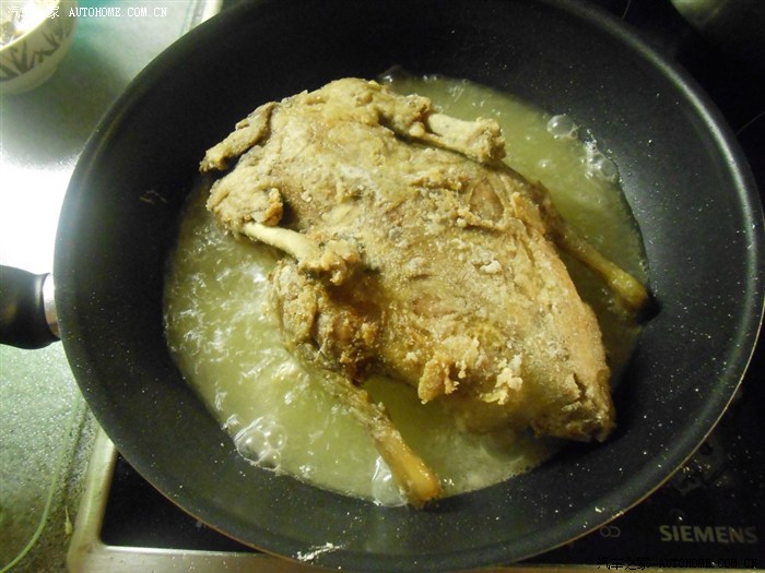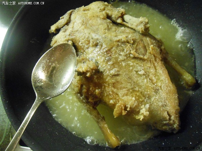 家庭制作不太可能放整锅油,很难没过整个鸭身,所以要不停滴用小勺往上面浇油,以保证炸制均匀。