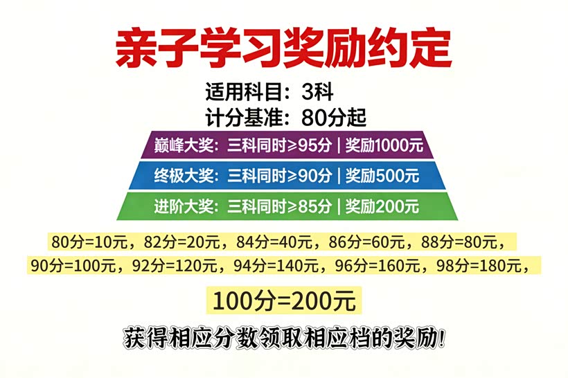 不过,2025年的尾巴上,还藏着一桩让我哭笑不得的“甜蜜烦恼”。期中考试前,瞅着孩子学习有点松懈,我灵机一动整了个“分数兑奖阶梯表”,拍着胸脯跟他保证:考90分就给100元,95分对应150元,98分直接兑180元,要是能考满分,那大奖更是上不封顶。当时琢磨着,这规则既能激励孩子,又不至于让我太破费,哪成想这小子直接开挂,不仅上课专心听讲,放学回家还主动刷题到深夜,周末连心爱的游戏都不碰了。成绩出来那天,他举着98、95、90的三张成绩单冲回家,我当场就懵了——当初只顾着定规则,压根没算过这高分组合该兑多少钱,真是搬起石头砸了自己的脚…“别人愁年终奖不够花,我愁儿子兑奖的钱有点多,这烦恼似乎有点幸福!”
