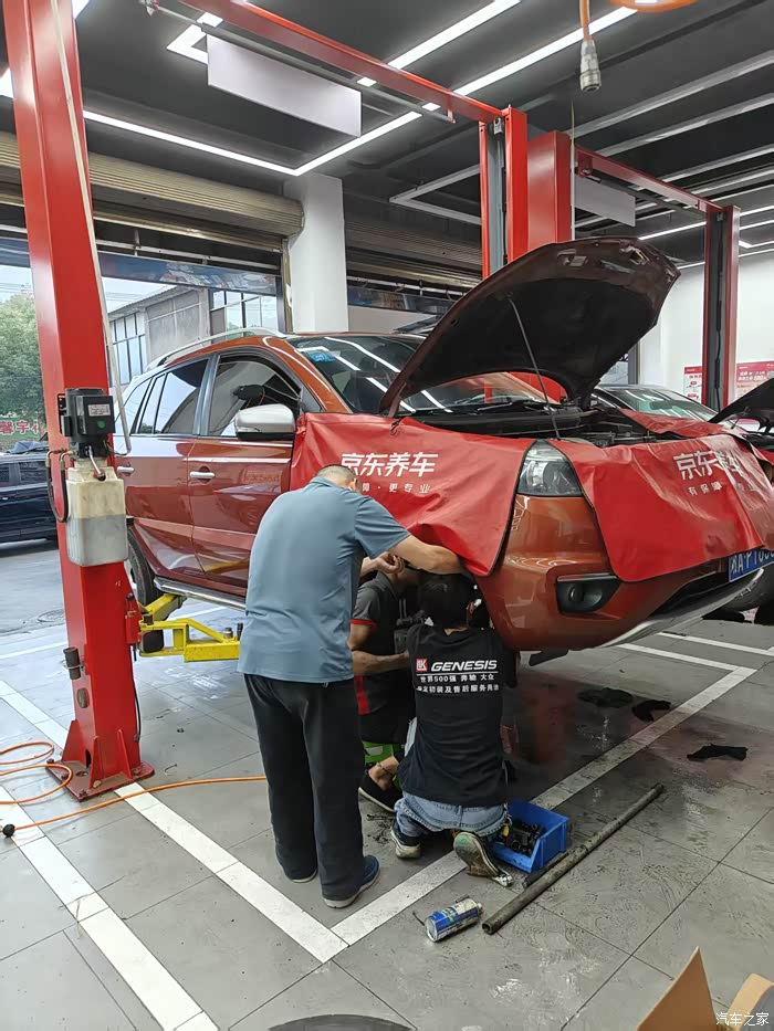 这次提前进场保养是因为发动机冷启动的时候有杂音,检查了有点缺机油。我还担心了一下,检查结果少机油的原因是油底壳螺栓滑丝了漏油。保养完以后和大师傅一起试了下车,结论是发动机还没过磨合期。