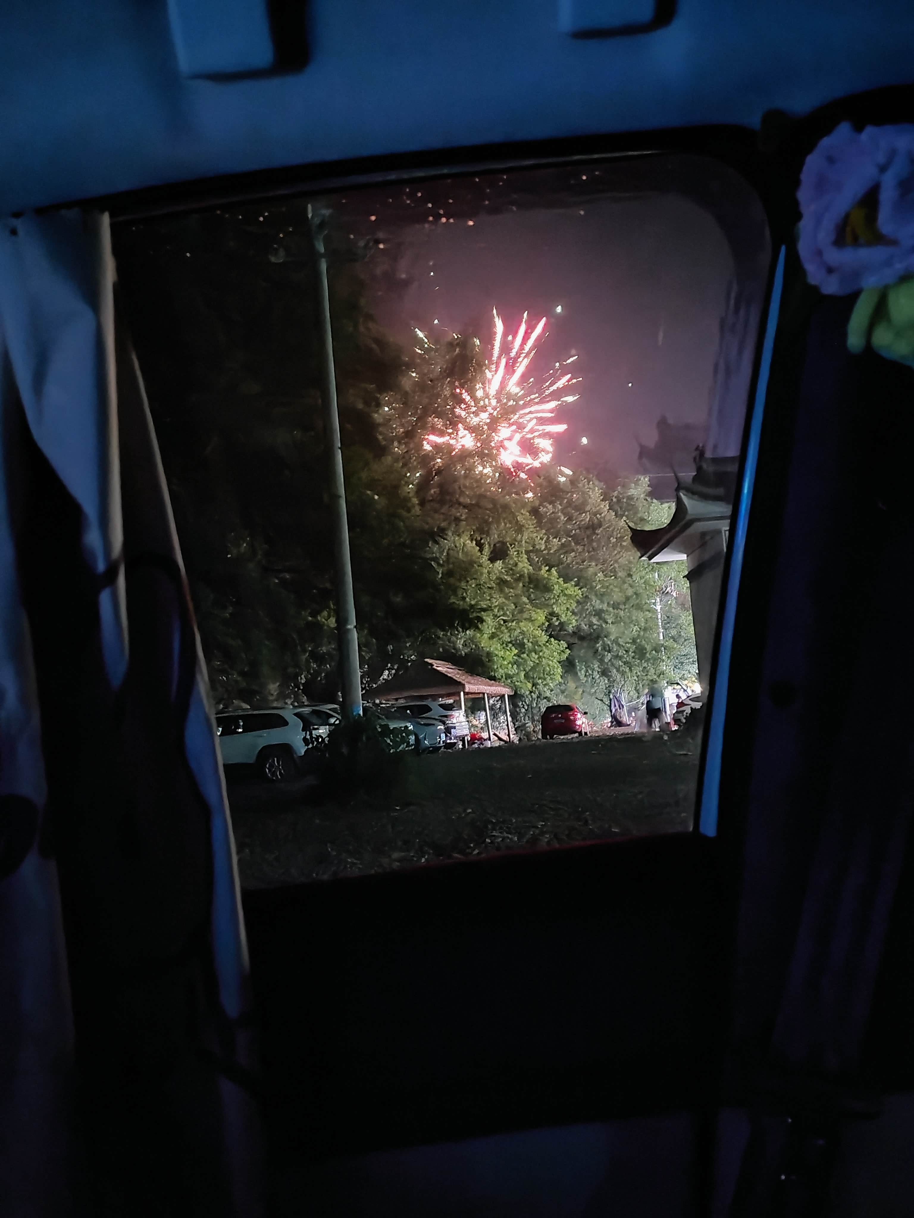 刚躺下没多久,外面突然传来“咻”的一声,紧接着是“嘭”的闷响。小昊一下子坐起来,扒着车窗往外看:“是烟花!”我把侧窗的遮阳帘拉开,夜空中炸开一团银蓝色的光,紧接着是粉的、金的,一朵接一朵,把天幕染得五彩斑斓。
