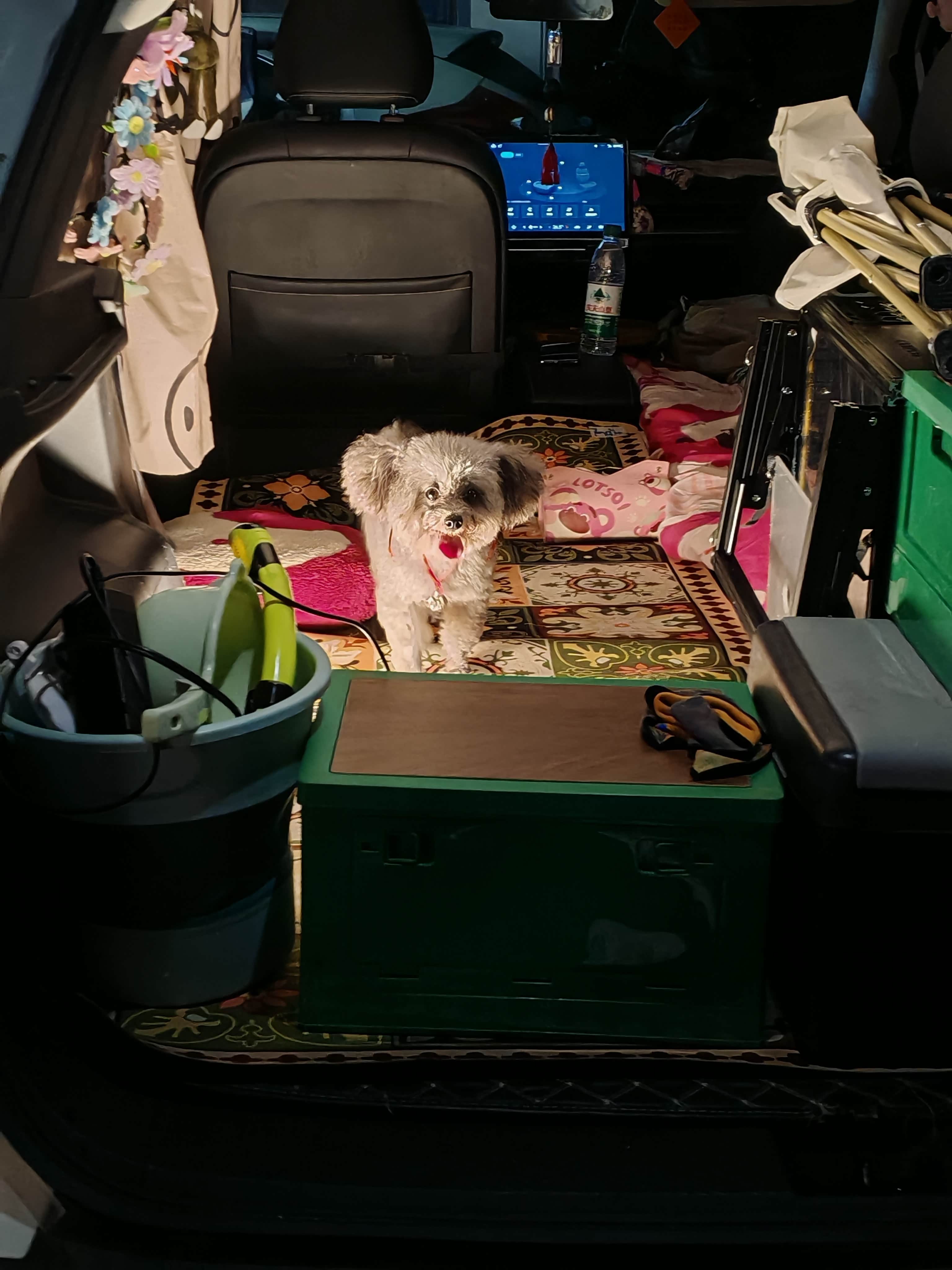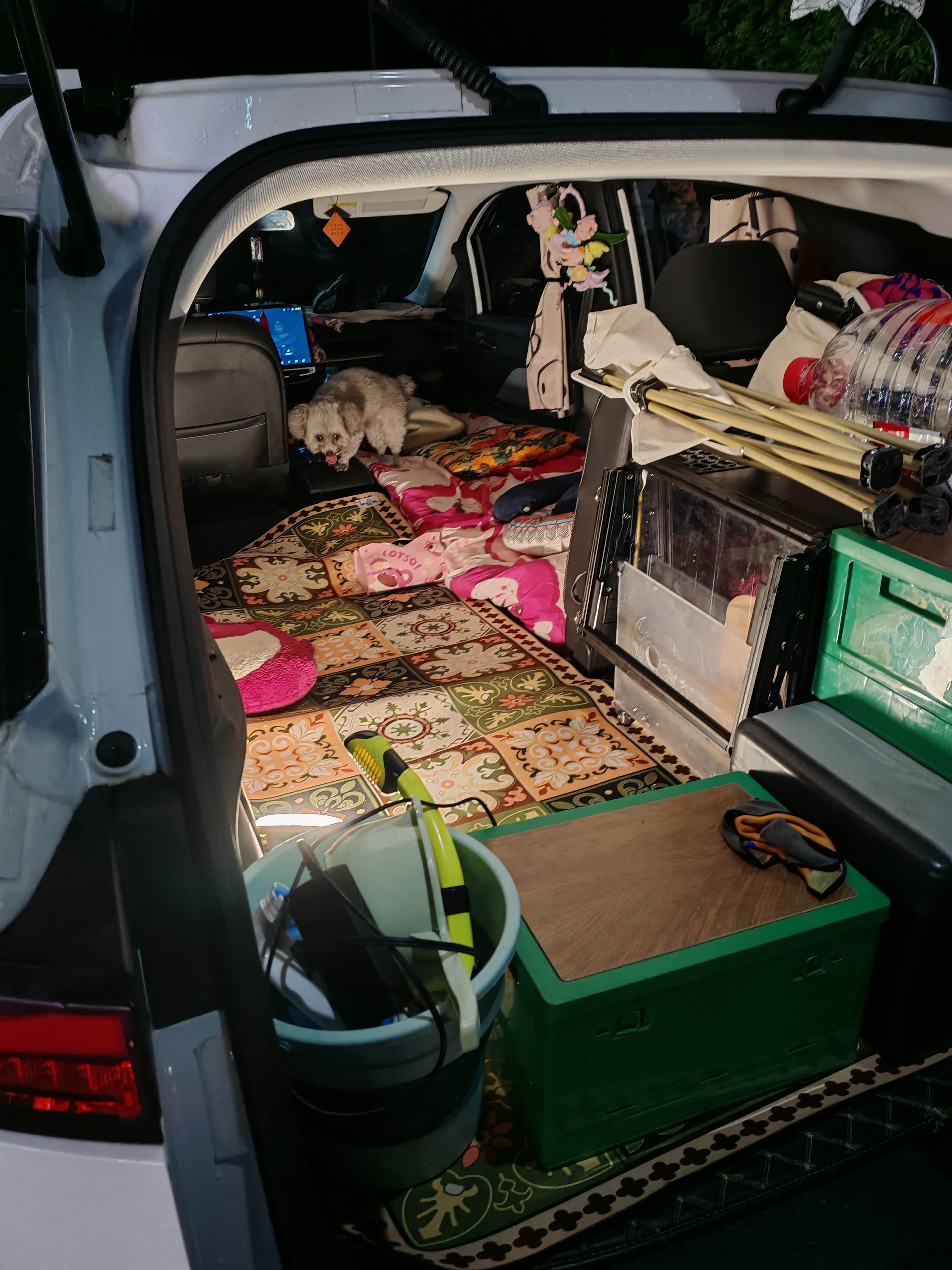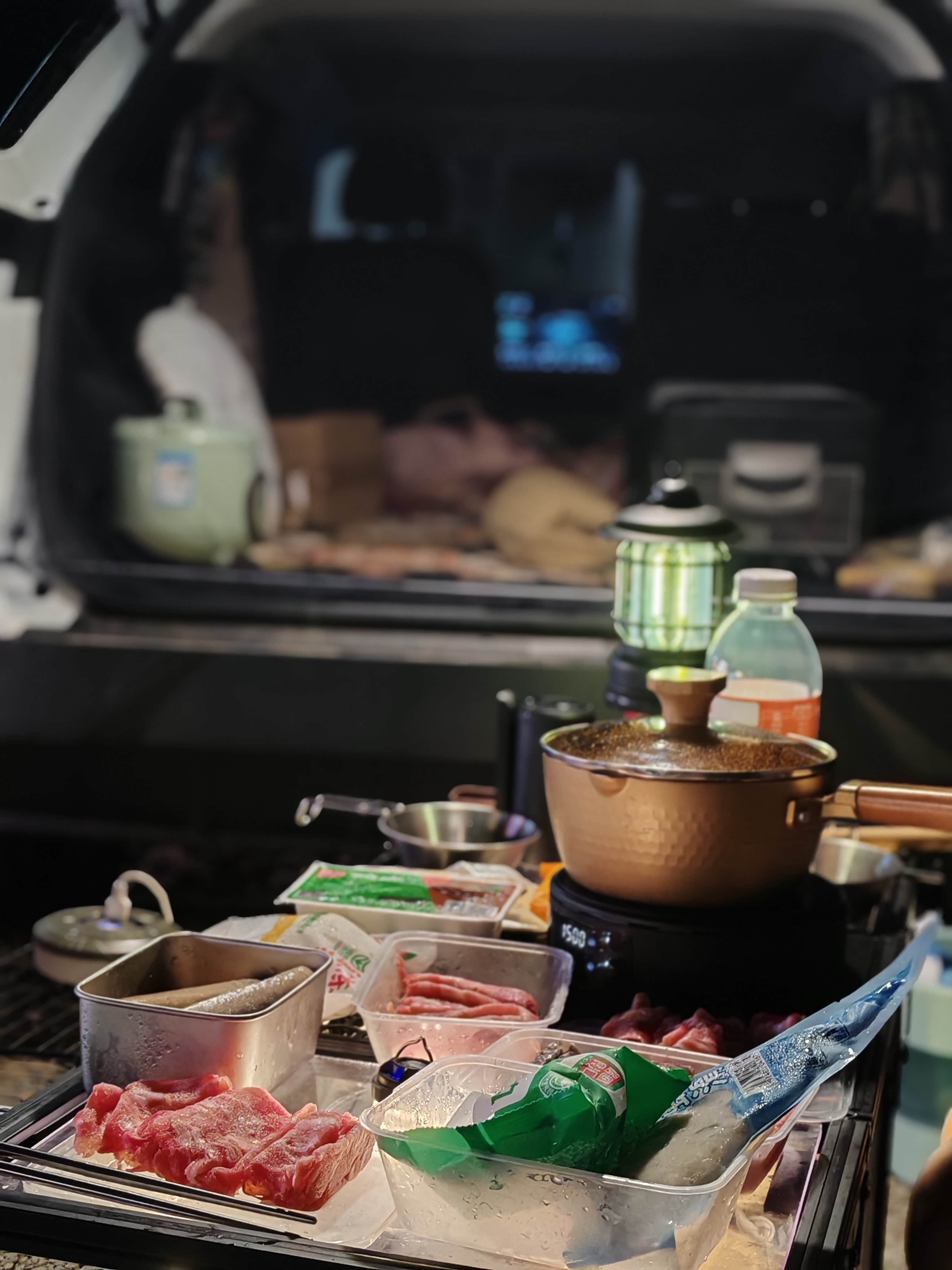 我俩分工收拾,倒也快。铝合金箱子方方正正,塞进后排左侧角落刚好卡牢,旁边留的空隙不多不少,正好放下20升的小冰箱,里面冻着他爱喝的冰可乐,贴着箱子还能借点凉气。折叠桌椅、露营灯、小电煮锅这些零碎,被我们分门别类塞进后备箱的凹槽里,连缝隙都没浪费。