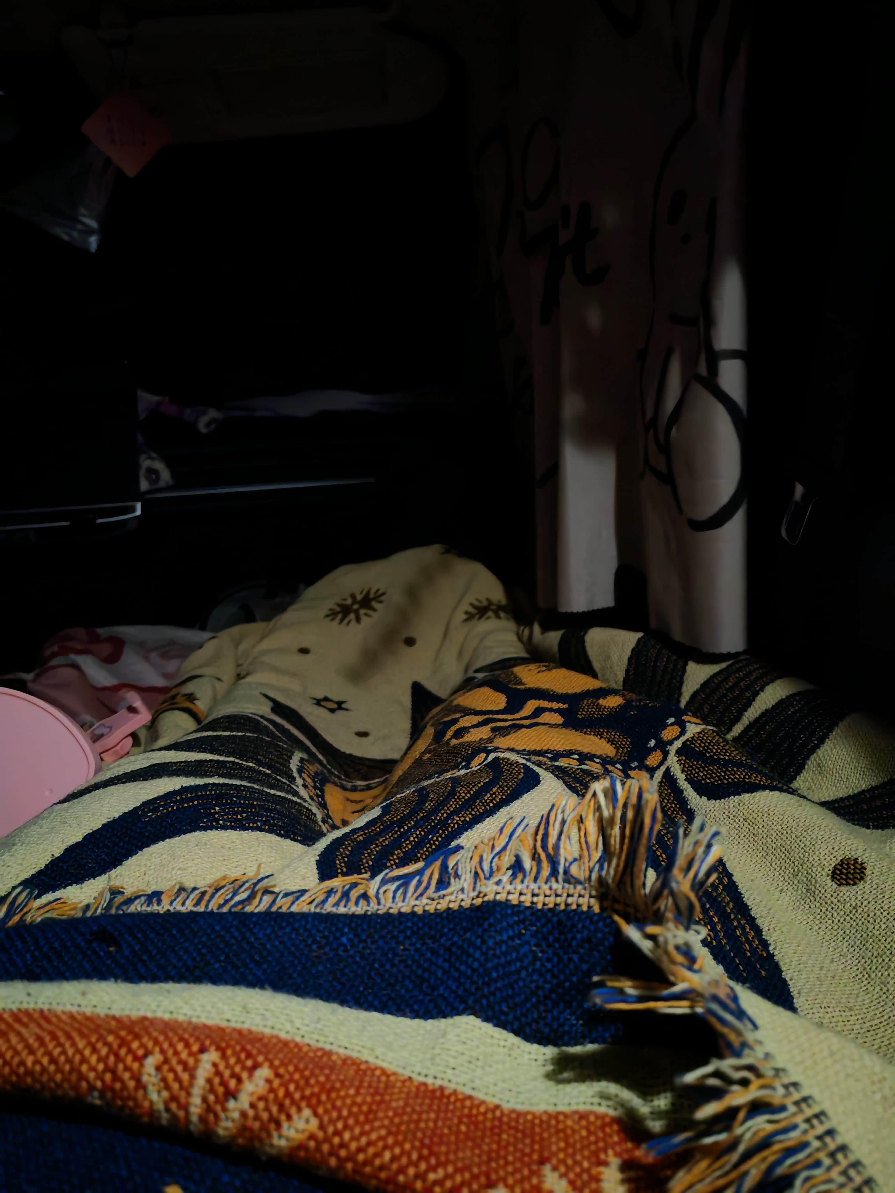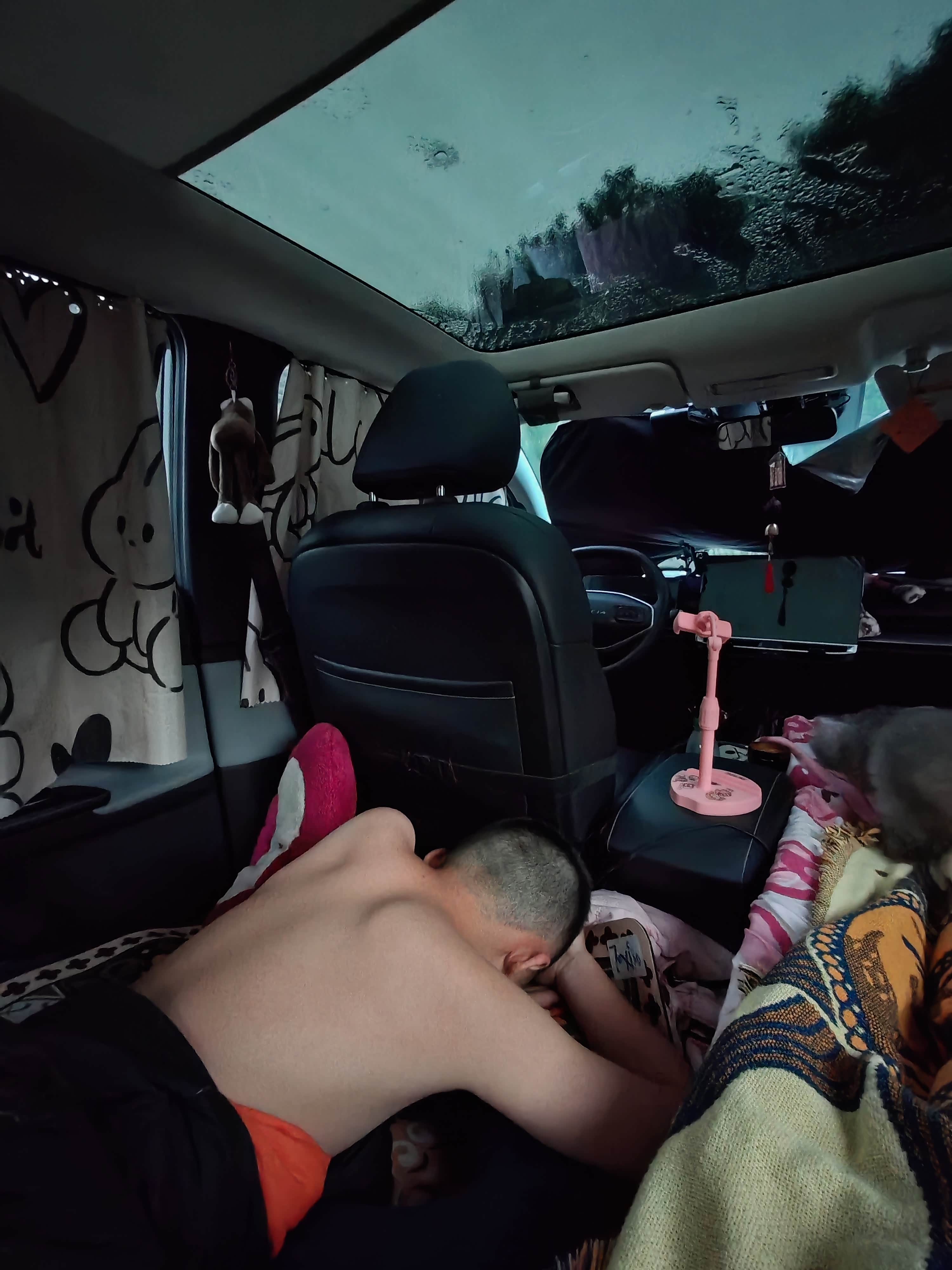 我选了副驾。把座椅调至最后,靠背放得稍斜,铺一张薄床垫,长度刚好够我蜷着腿躺下。头顶的阅读灯调至暖黄,光线透过纱帘落在小昊那边,能隐约看见他摆弄手机的影子。