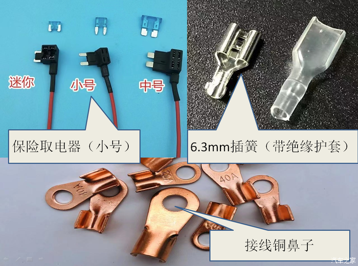 3、接线铜鼻子(15A以上规格皆可,每个点烟器母座需要一枚,用于负极线车体接线);