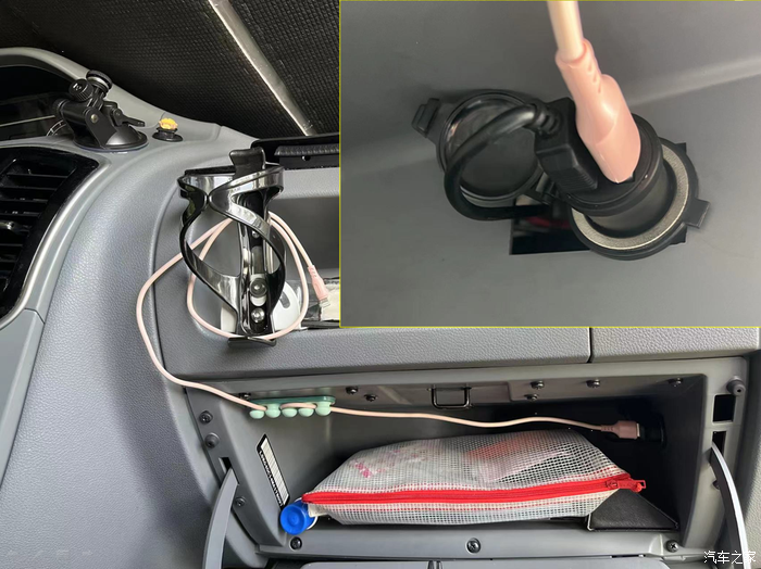 额外增加了两个点烟器插座,其中一个点烟器母座拉线到二排座椅位置,专门用于户外电源的行车充电(估计很多车友会采用从发动机舱直接拉比较粗的电源线过来给副电瓶进行大功率充电,因为我的户外电源比较小,同时驻车用电量需求也不大,所以暂时从保险盒取电所能提供的充电功率也基本够用了,走线也更方便)。另一个点烟器母座则安置在了副驾驶储物箱里面,用于副驾驶位置的U-S-B充电和行车记录仪的供电。