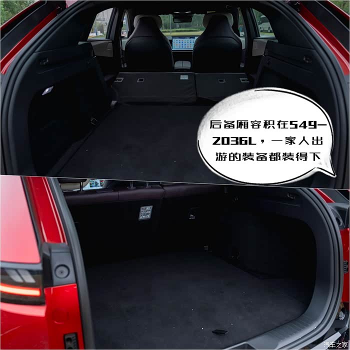 后备厢容积在549-2036L,正常情况下足够日常使用,后排座椅放倒后,空间能进一步扩大,一家人出游的装备都装得下。