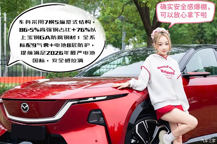安全是马自达刻在骨子里的基因,莉莉也问到了这点,马自达EZ-60车身结构采用7横5纵笼式设计,高强钢占比达86.5%,热成型钢占比27.45%。而且车上总共有9个气囊,不过最让我觉得巧妙的,是中控台前面那个气囊,它弹出的时候会有一个翻越大屏的动作,这样就解决了现在很多新能源车因为屏幕太大、影响气囊保护效果的问题。