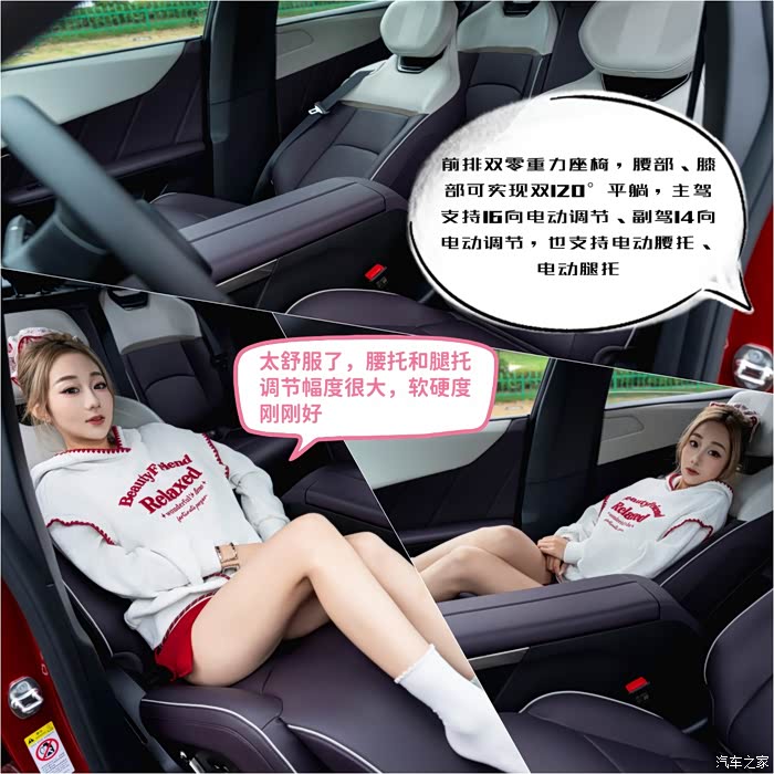 比如说主副驾都是零重力的座椅,这个座椅并不是说让你完全去躺平,而是它可以后仰120度角之后,让你的心脏和你的膝盖保持在同一个水平线上,这是人最舒服最放松的一个姿势,看莉莉躺下后都不想起来了,这种舒适度,真的不输某些豪华品牌。
