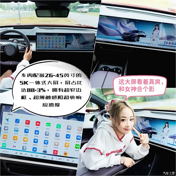 这车总共有6块屏幕,当然最吸睛的就是那块26.45英寸5K一体式大屏,虽然是一整块屏幕,但看上去像双联屏。
