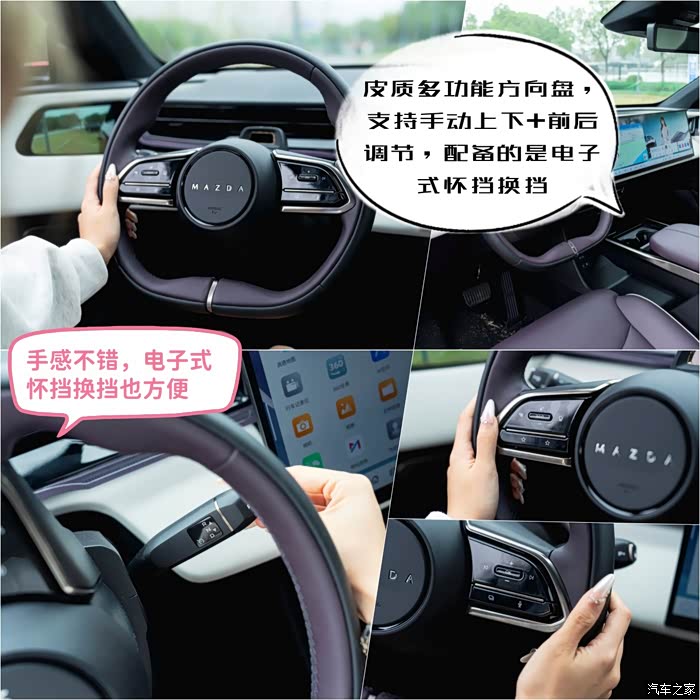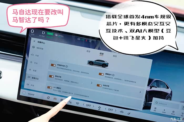 莉莉尝试了一下大屏,她跟我说:马自达现在要改叫马智达了吗?果然这车的智能化是最大的亮点,它直接将4nm车规级芯片下放了,这算力可是主流 SA8155芯片的1.6倍,自然操作起来丝滑流畅。而且还实现了“所指即可控”的多模态交互,我们只需要指向遮阳帘、车窗等部件,说出相应指令,即可实现精准控制。