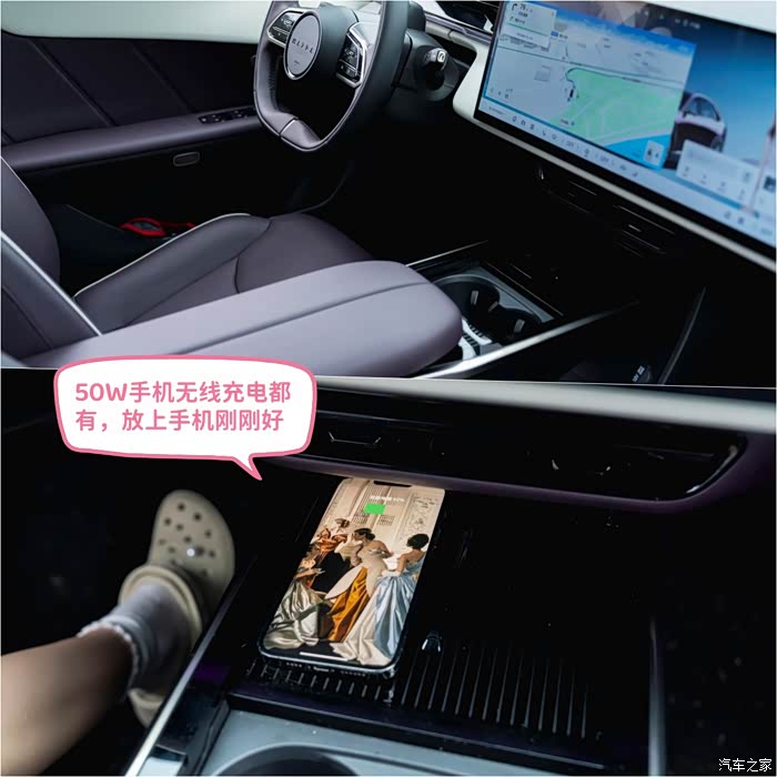 中控区很干净,像是50W手机无线充电都没有缺席,手机放上去刚刚好。