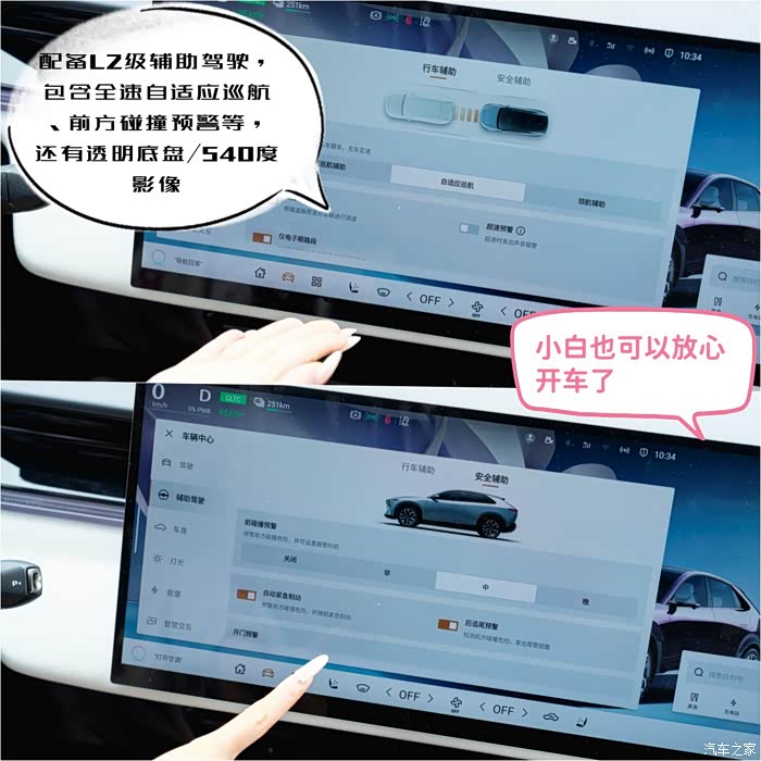 此外,鉴于莉莉是一个新手,这车也配备了L2级辅助驾驶,包含全速自适应巡航、前方碰撞预警等还有透明底盘/540度影像,小白也可以轻松驾驭。