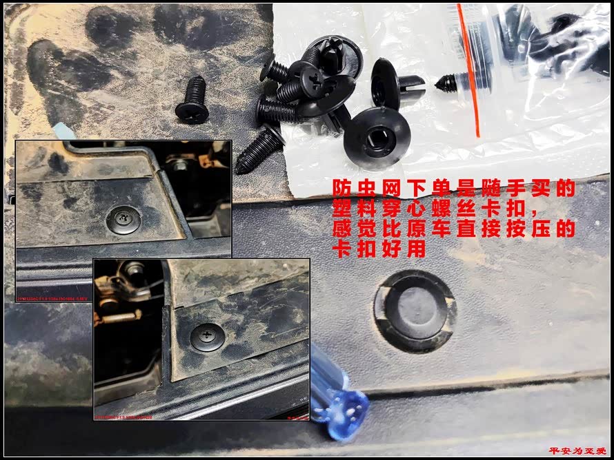 中网搞定后,开始研究下唇进气口防虫网的安装方法,虽然有安装说明,但和配发的安装件都不一样,自己先研究了一下,有点含糊时请教了一下车友,最后终于找到了正确的固定方式。