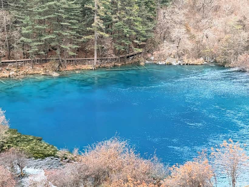 回程的高铁上,翻看着照片,忽然想起苏轼的“人间至味是清欢”。九寨沟的美,从不是浓墨重彩的,而是像一汪清泉,静静淌过心间。一月的它,少了些热闹,多了些清冷,却更显本真——冰是冰,水是水,山是山,在天地间自在成景。