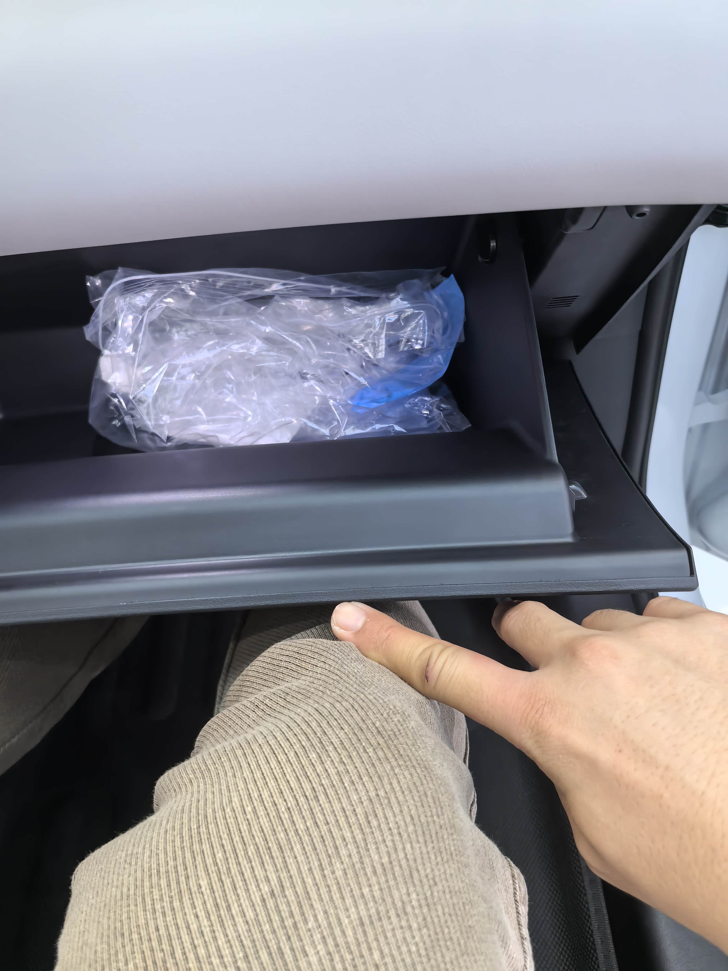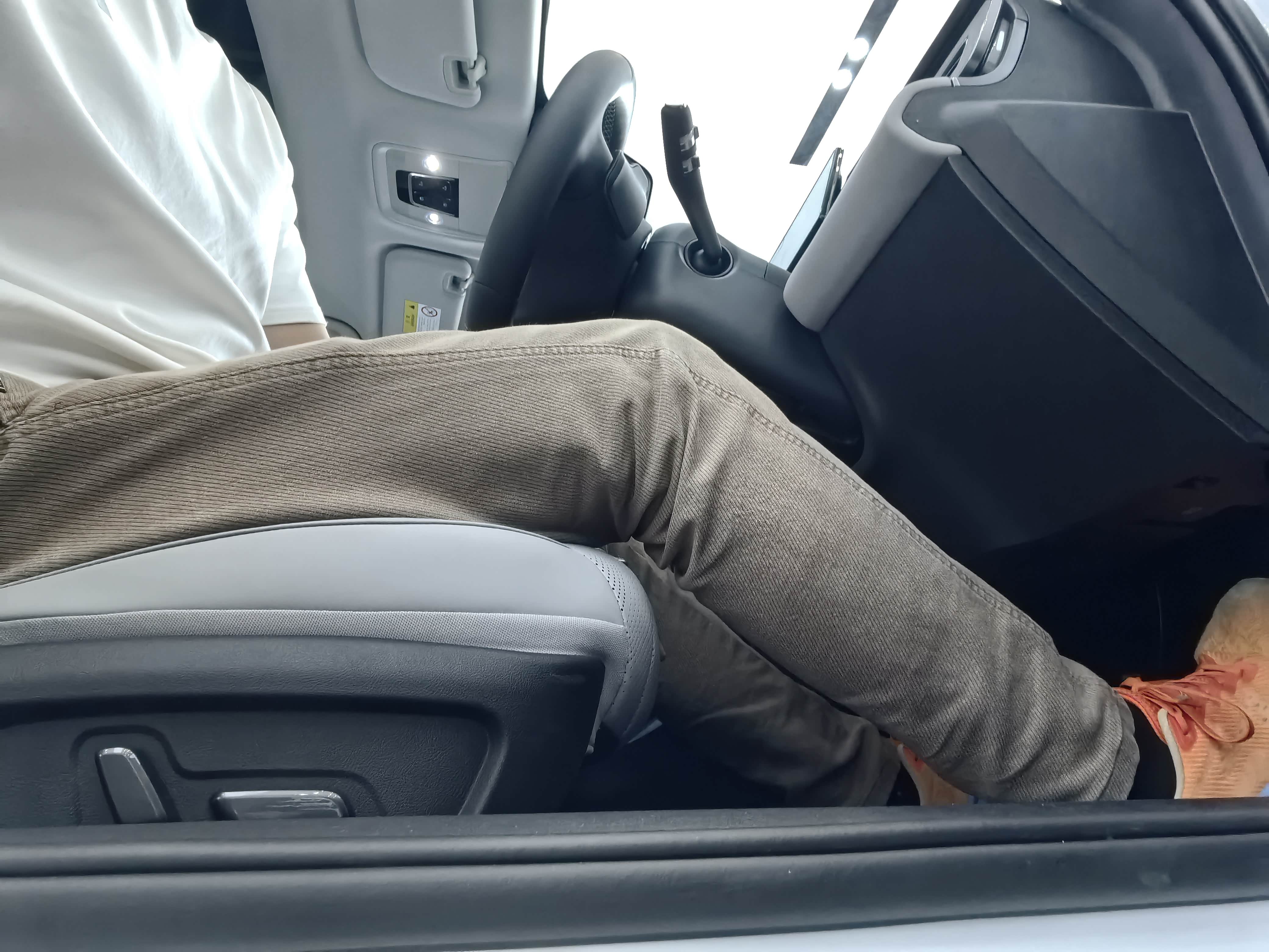 ②低配副驾没有电动座椅调节按钮,所以其高度是固定的,只能调节前后距离,只是这里有点不足就是像我这高度的人只能将座椅往后移动才可以放直双腿,同样其副驾隐藏储物阁才能不碰到膝盖,这点对副驾后排乘坐人不怎么友好。