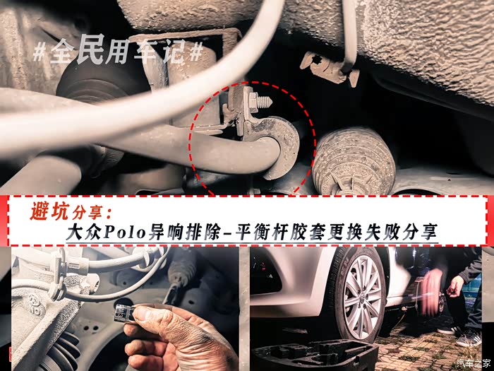 最开始以为是减震器、顶胶的问题,最后网上查阅,发现POLO车友都有这样的问题,根据大伙的经验分享,初步判定大概率是由于平衡杆胶套老化所导致的。