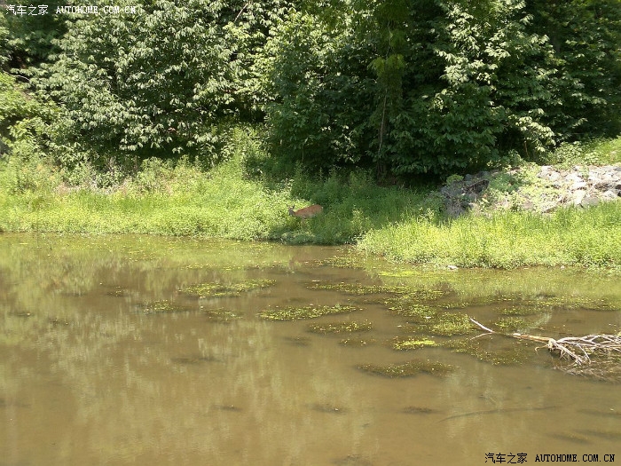 路边有点死水,对面有只小鹿在喝水,