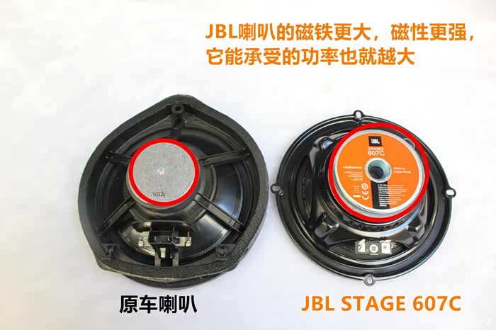 没有对比就没有伤害,这个就是原车喇叭和JBL喇叭的区别,后面的磁铁决定了喇叭对于音频信号的把控程度可以到多少,磁铁越大磁性越强,承受的功率就越大,那么喇叭出来的效果也就越好。另外一个就是喇叭的音盆,原车是纸质音盆,容易受潮,JBL的这款是聚丙烯材质音盆。