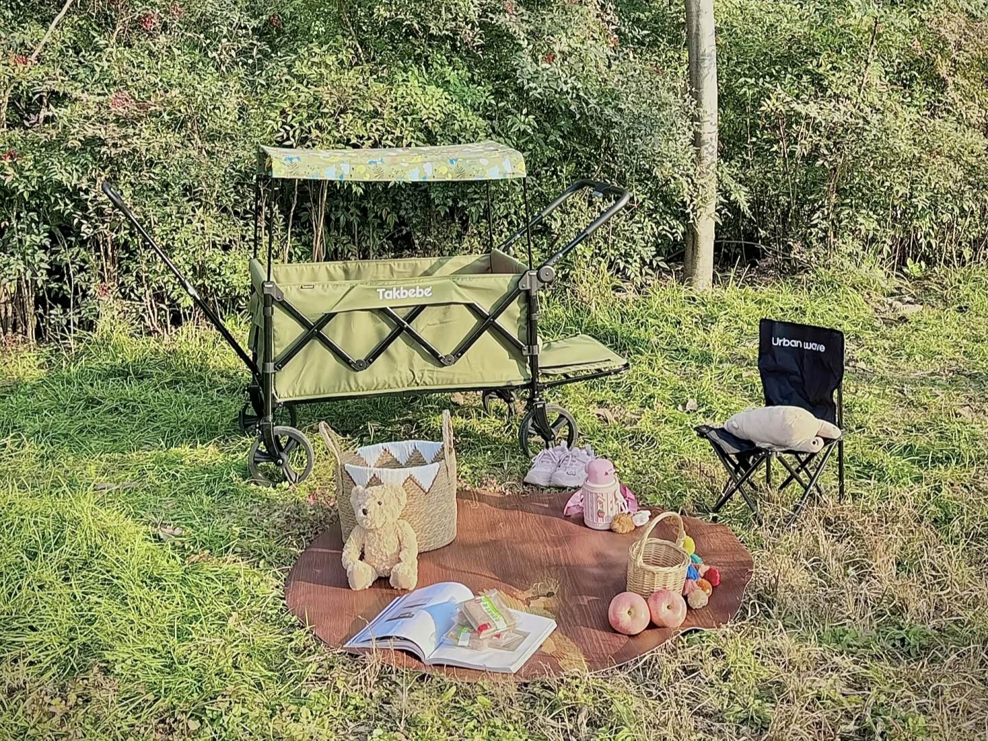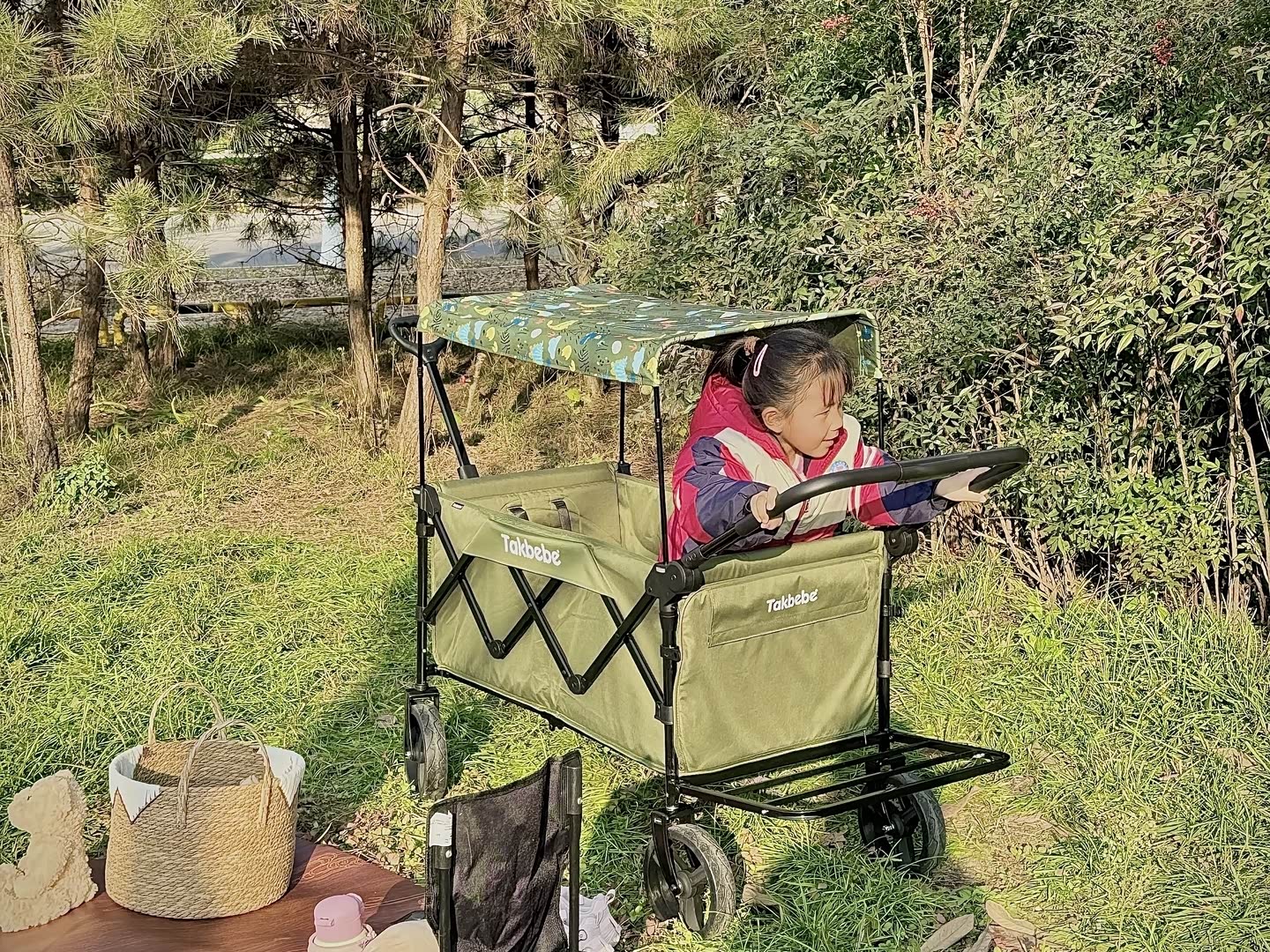 到了露营地,打开车门就是满眼的秋色,清新的空气扑面而来。搭帐篷的时候,老婆负责铺野餐垫,女儿在旁边追着蝴蝶跑,我从后备箱搬东西,来回几趟就把营地布置好了。晒着暖烘烘的太阳,喝着热茶,看着女儿在草地上撒欢,老婆在一旁笑着抓拍,突然就觉得,幸福其实很简单。