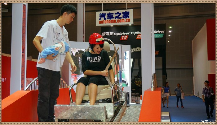 成都国际车展上,汽车之家馆内展台的项目是体验儿童安全座椅的重要性。