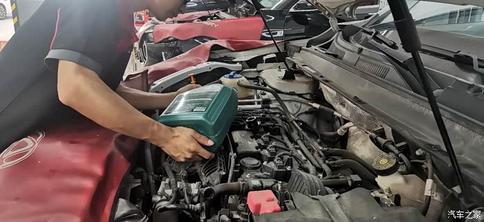 4,放下车辆,加注新的机油,装上新的空气芯,启动发动机,再把车辆升起,检查机舱底部是否有漏油现象,确认后放下车辆,熄火,检查机油尺刻度,确认机油量。检查火花塞。