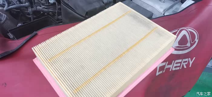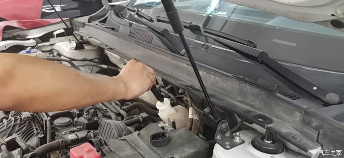 2,保养技师把车开到保养工位,拆开发动机舱盖板,打开机油盖,扒出机油尺一部分,方便等下放油更彻底。拆开空气滤芯盒取出空调滤芯,拆下机油滤芯,更换新的机油滤芯,拆掉空调滤芯。检测电瓶,防冻液,刹车油。