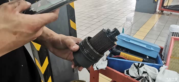 拆机油滤芯,机油滤芯每次保养都要更换,起到过滤机油里面的铁削杂质的作用,可以有效保护发动机内部零部件。如果机油滤芯太脏,就会造成机油循环不均匀,造成发动机磨损。