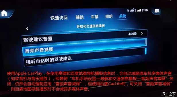 之前开其他车都没有出现这种情况。后来网上查了查,说把音频声音减弱关闭,但是关了之后对车机自带的导航有效果,对CarPlay没作用。