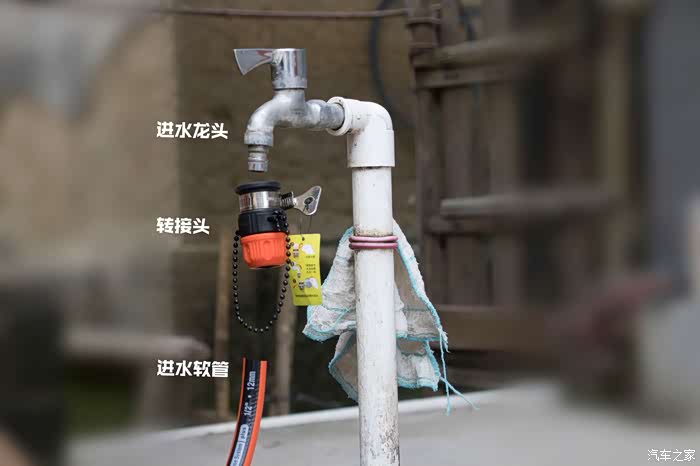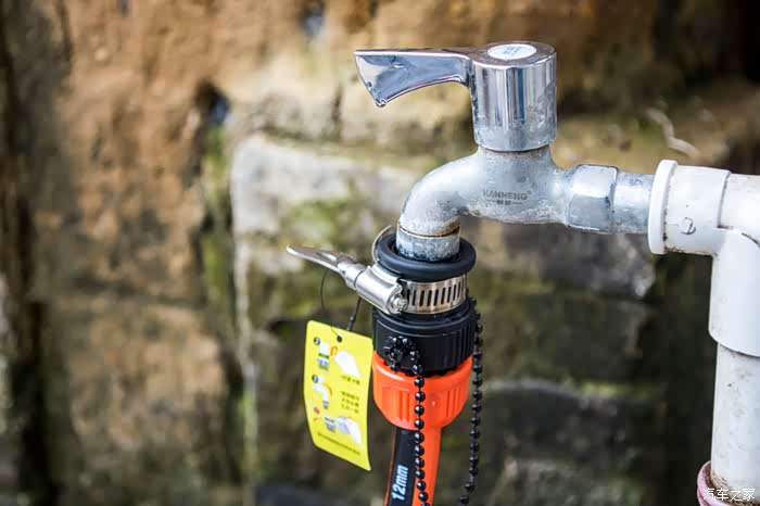 。在开洗之前,当然要先接下管线,这款洗车机配备好几个快插接口,常见的水嘴/水龙头都可以轻松接上。