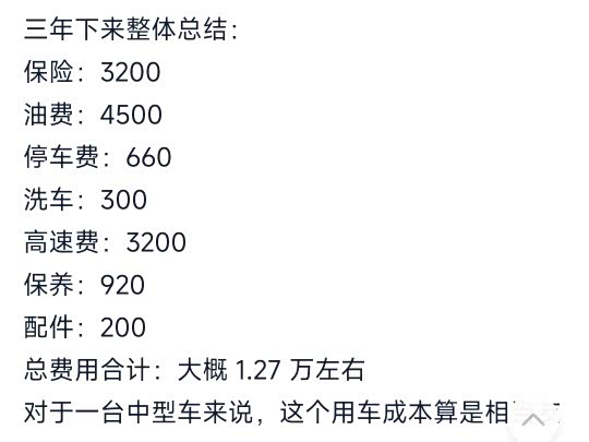 把这三年的用车费用简单算了一下,平均下来一年大概在一万三左右,这其中油费是大头,其次是保险。