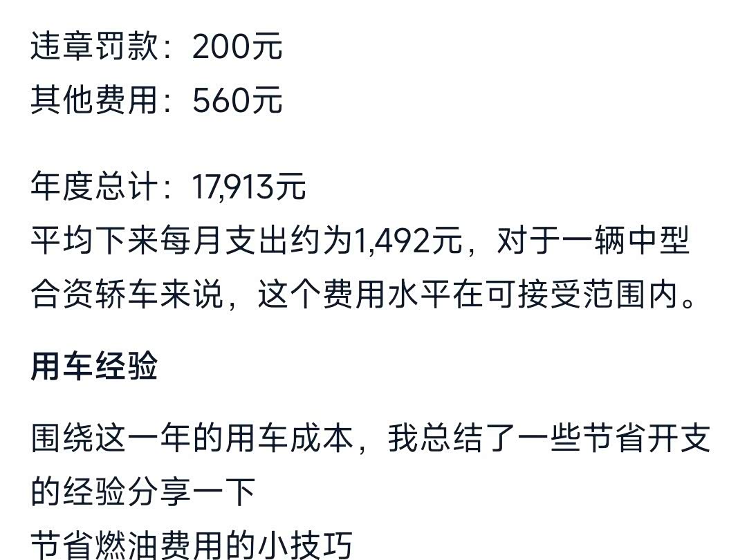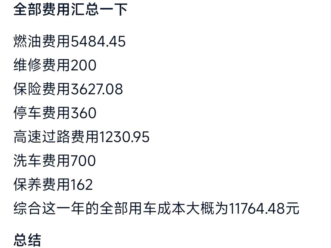 大概一个费用就这些了吧!这其中油费保险高速费是大头,其他没有特别惊喜,但也谈不上负担,对我来说是可以接受的。