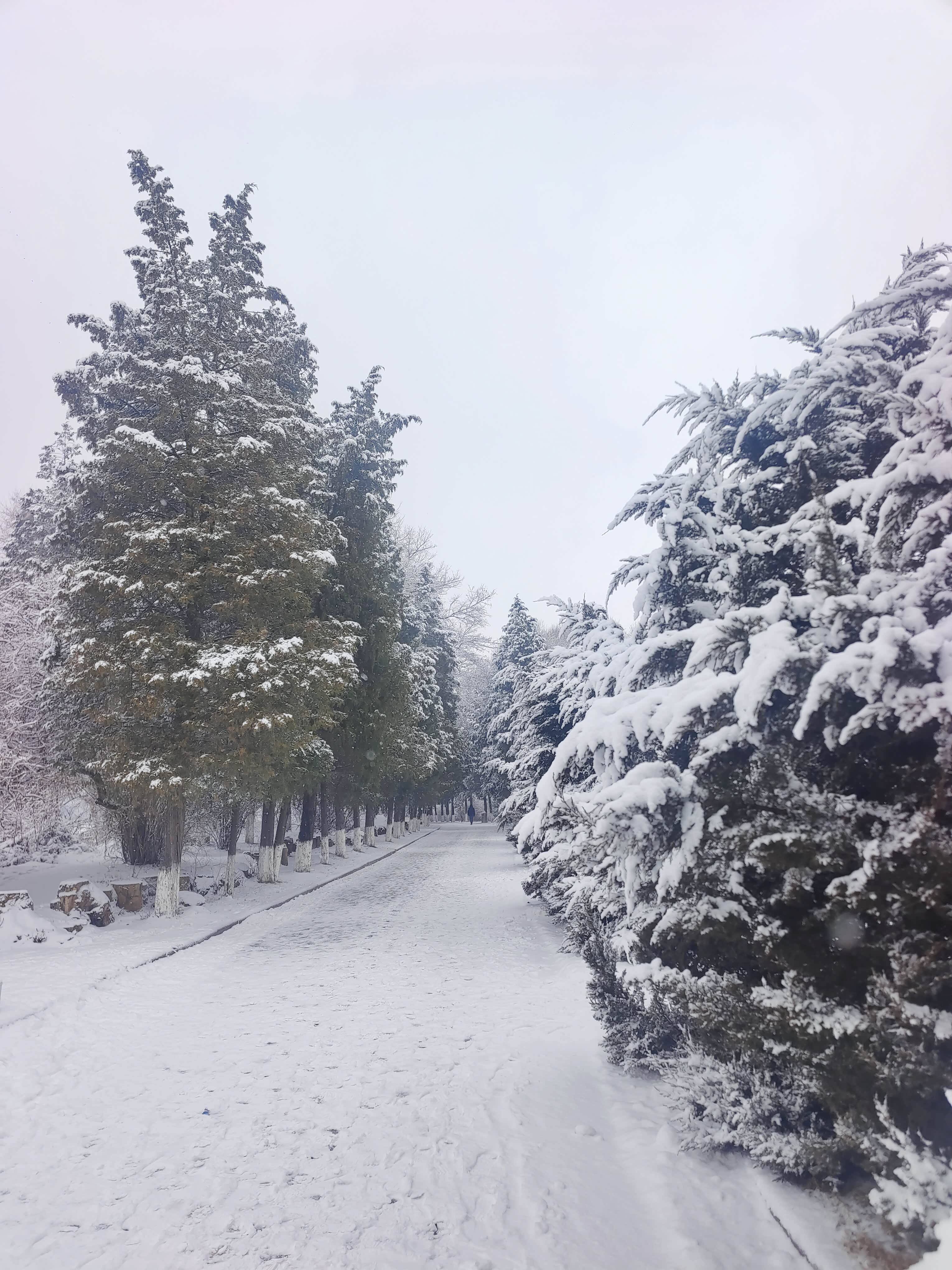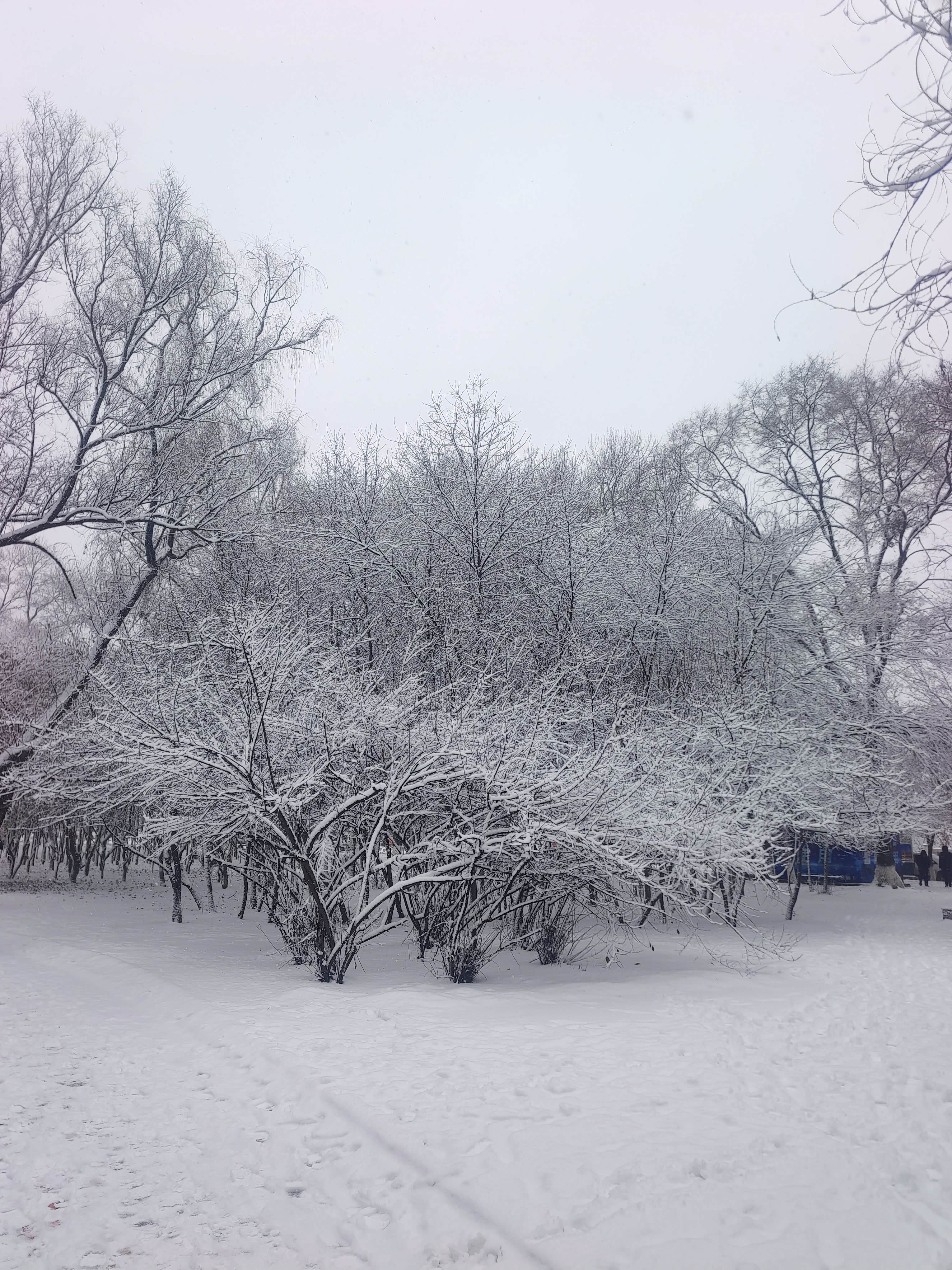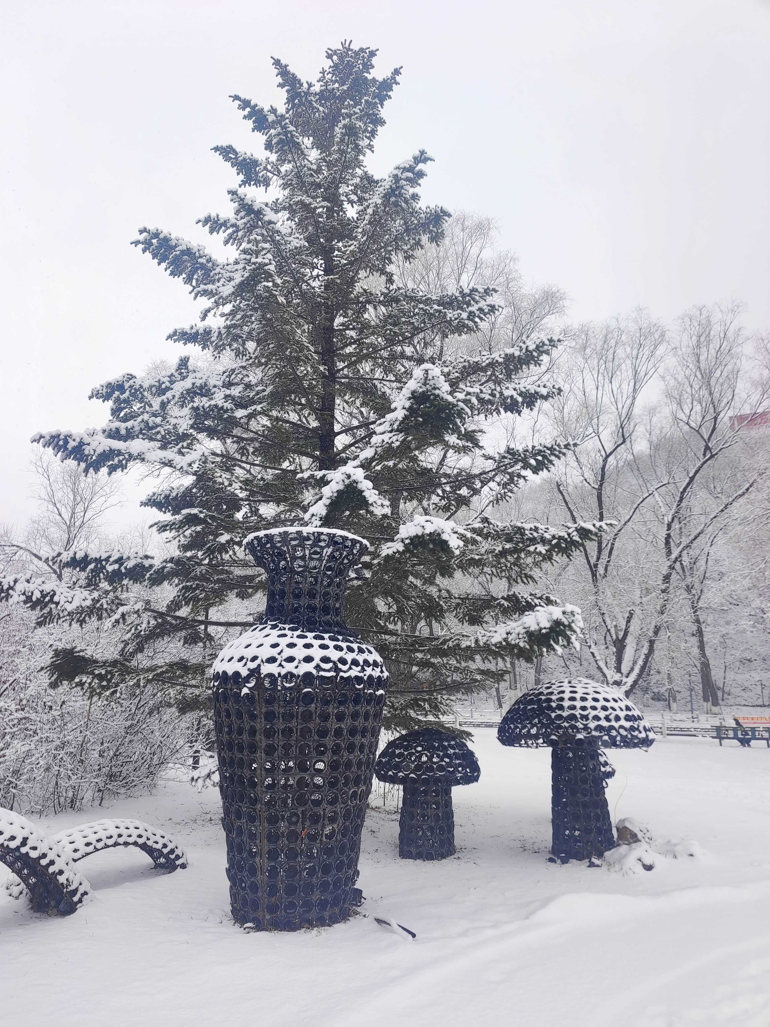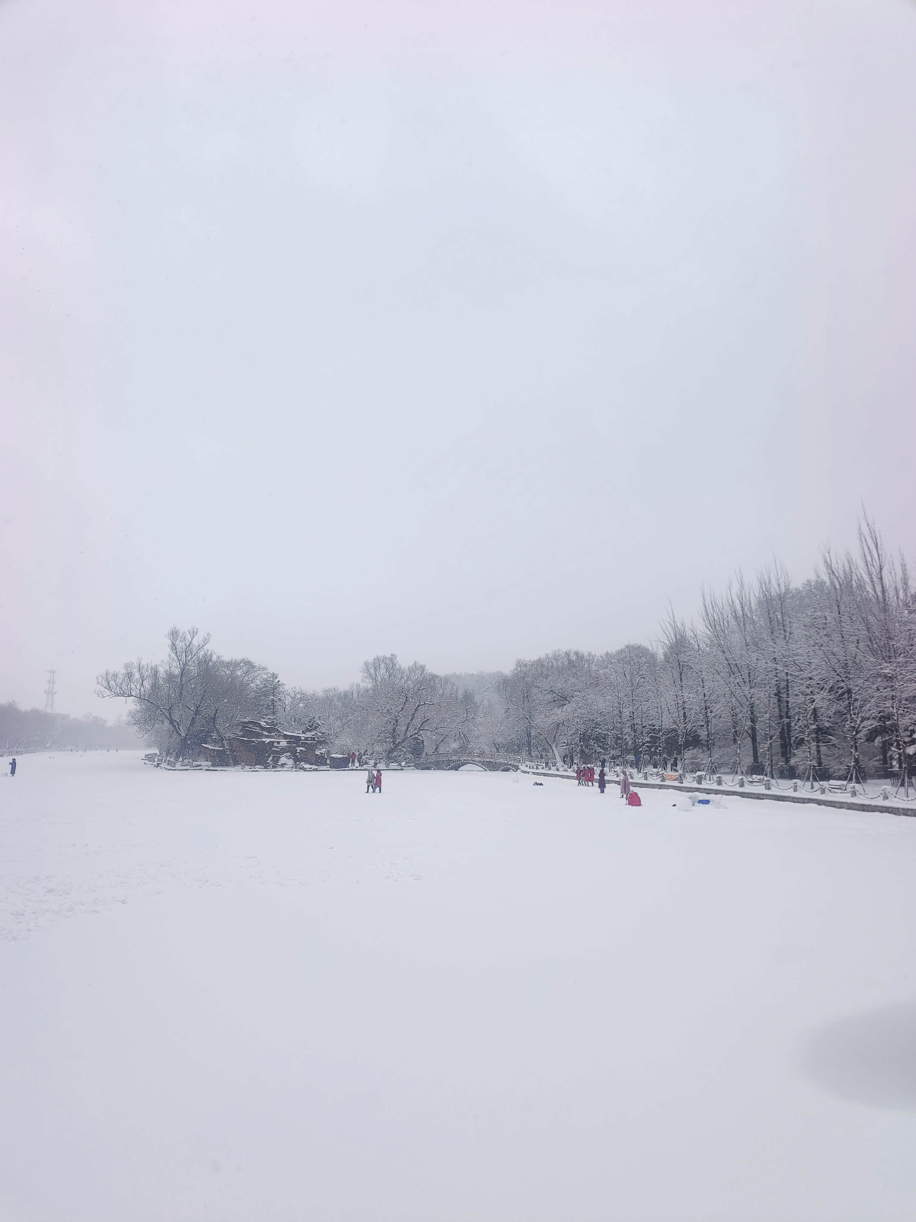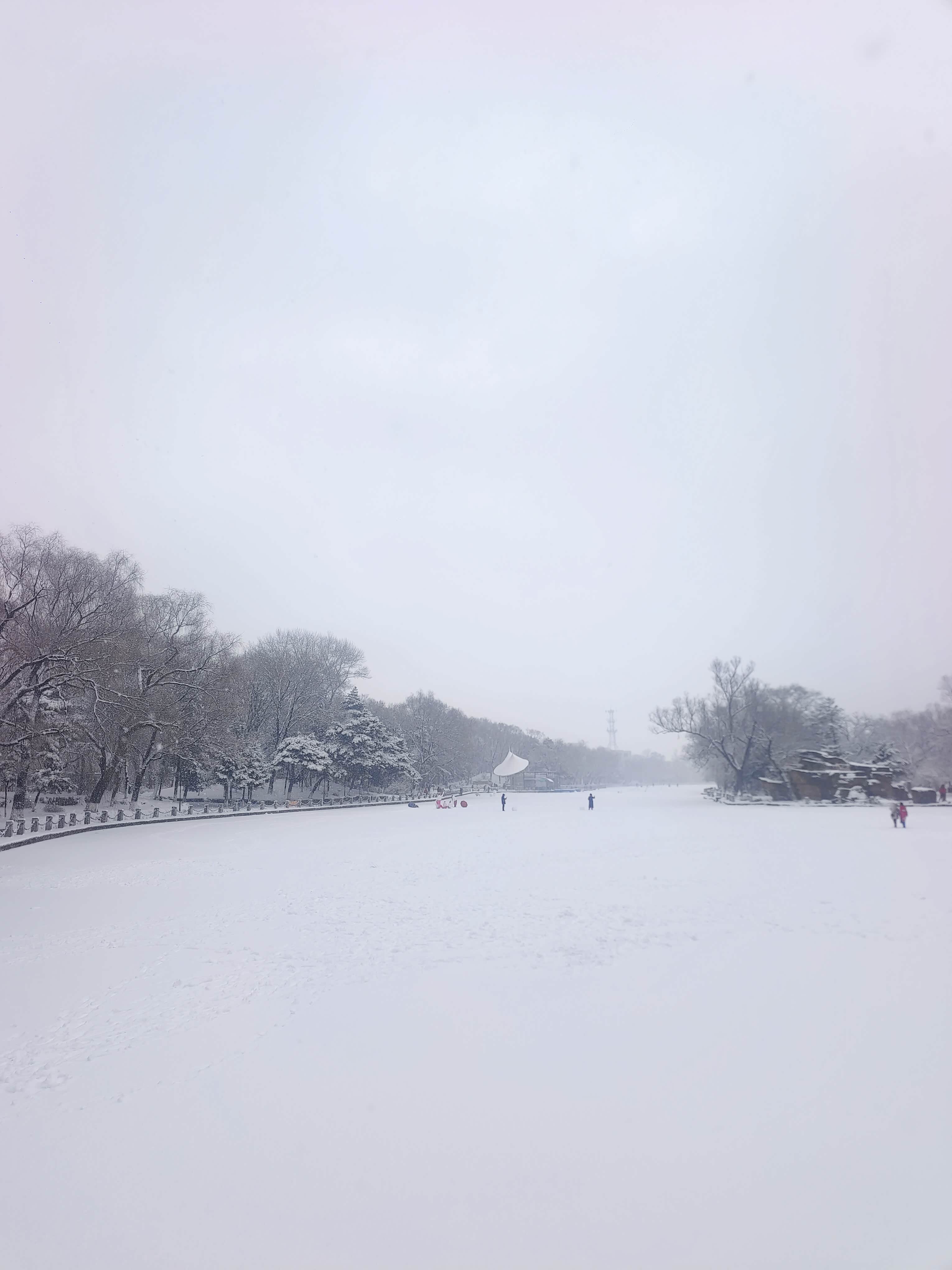 整个公园被染成纯白,变成白色的世界。往日里彩色的健身器材、青灰色的石板路,全都被厚厚的积雪覆盖,只留下模糊的轮廓。湖面结了厚冰,冰面又盖着雪,和岸边的雪堆连成一片。天地间只剩纯粹的白,连空气里都飘着雪的清新气息。
